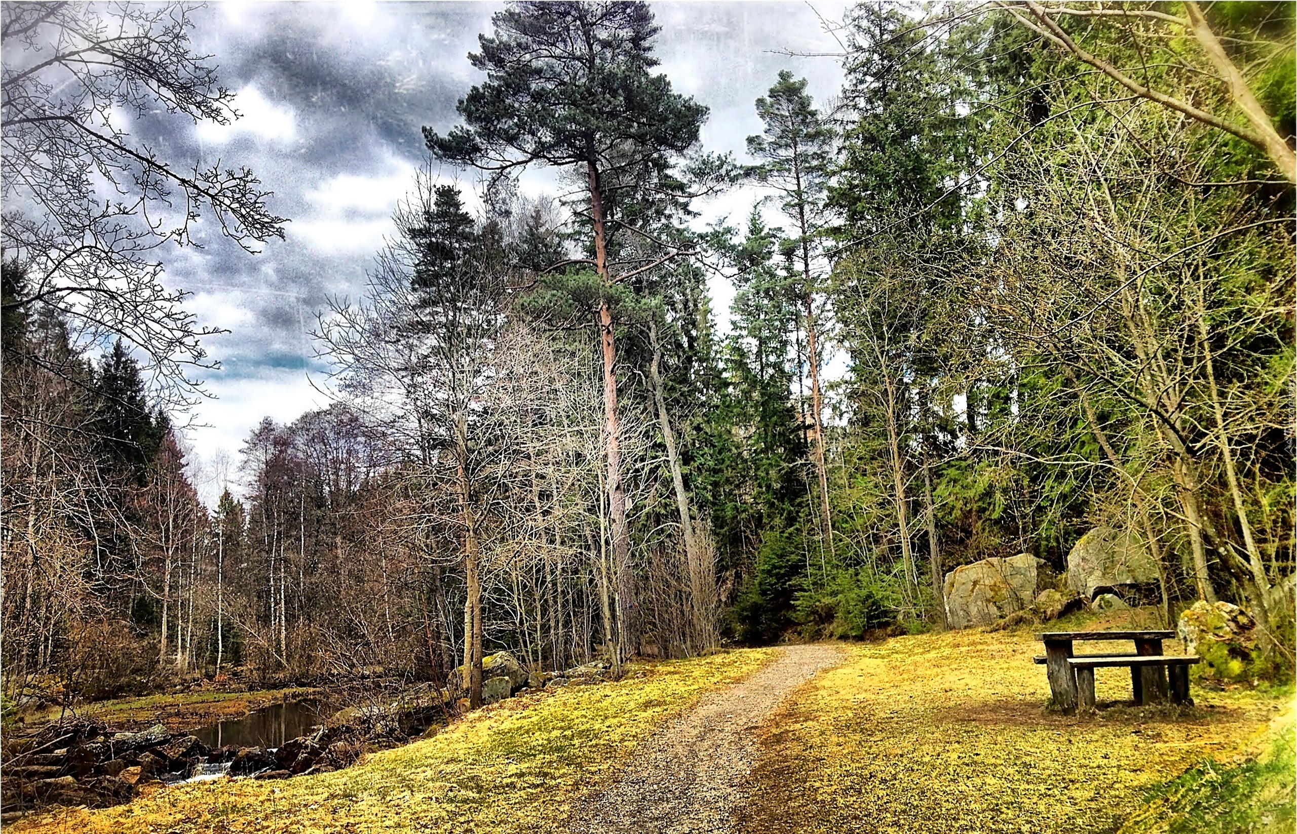 Edytor tapety: Las, Rzeczka, Kamienie, Dróżka, Ławka
