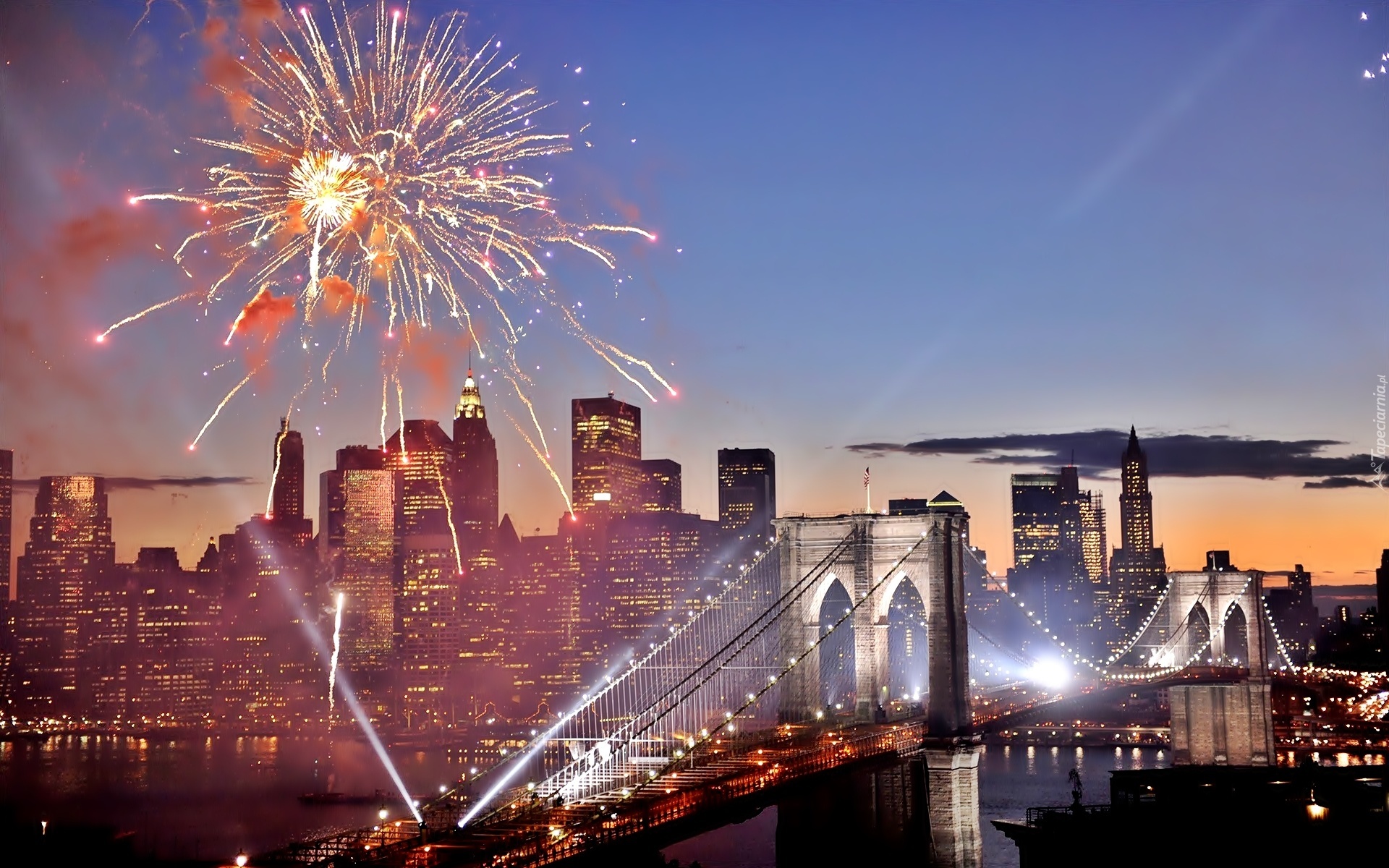 Edytor tapety: Miasta, Nocą, Most, Rzeka, Drapacze Chmur, Fajerwerki