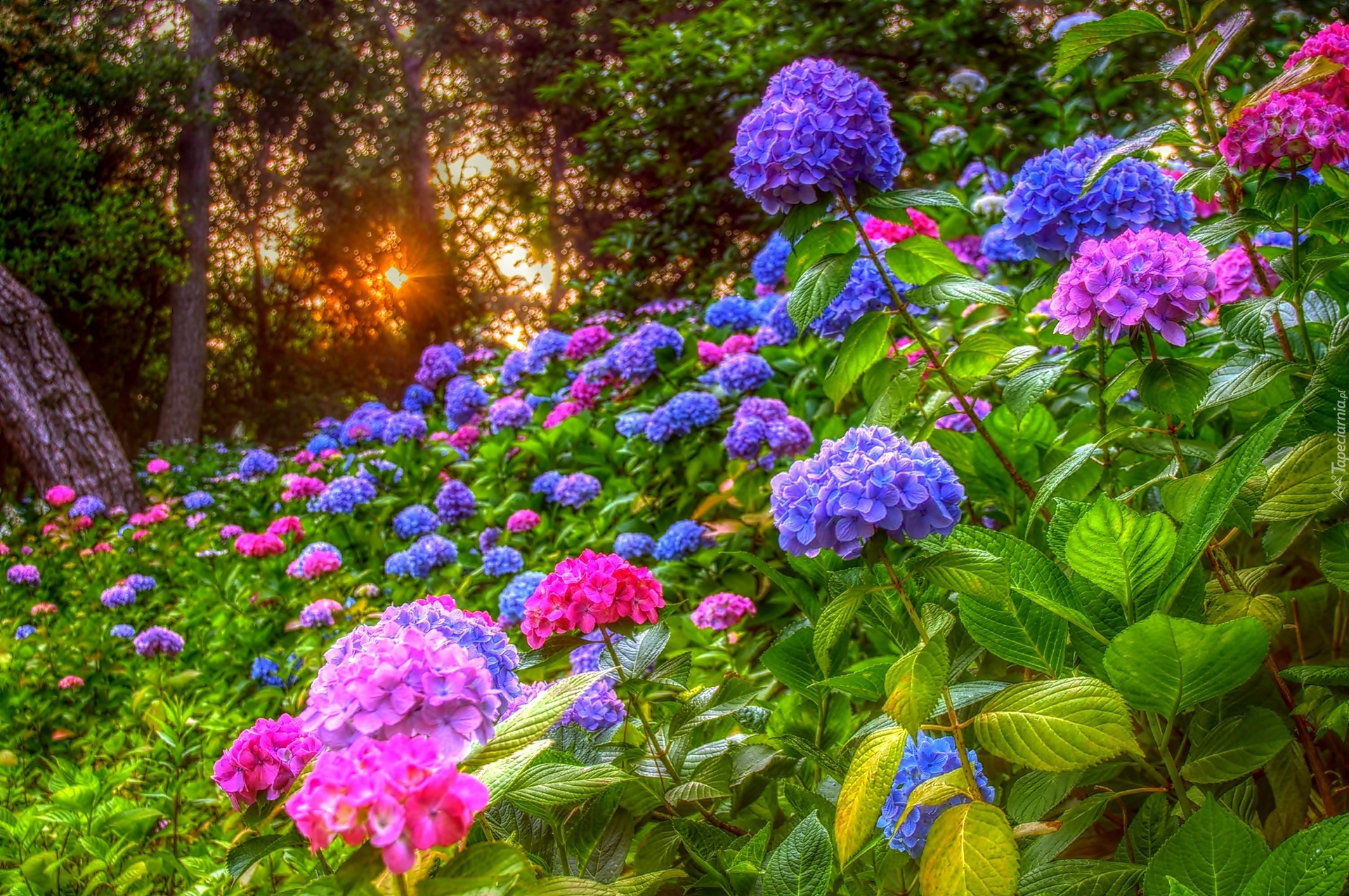 Edytor tapety: Zachód Słońca, Drzewa, Kolorowe, Hortensje