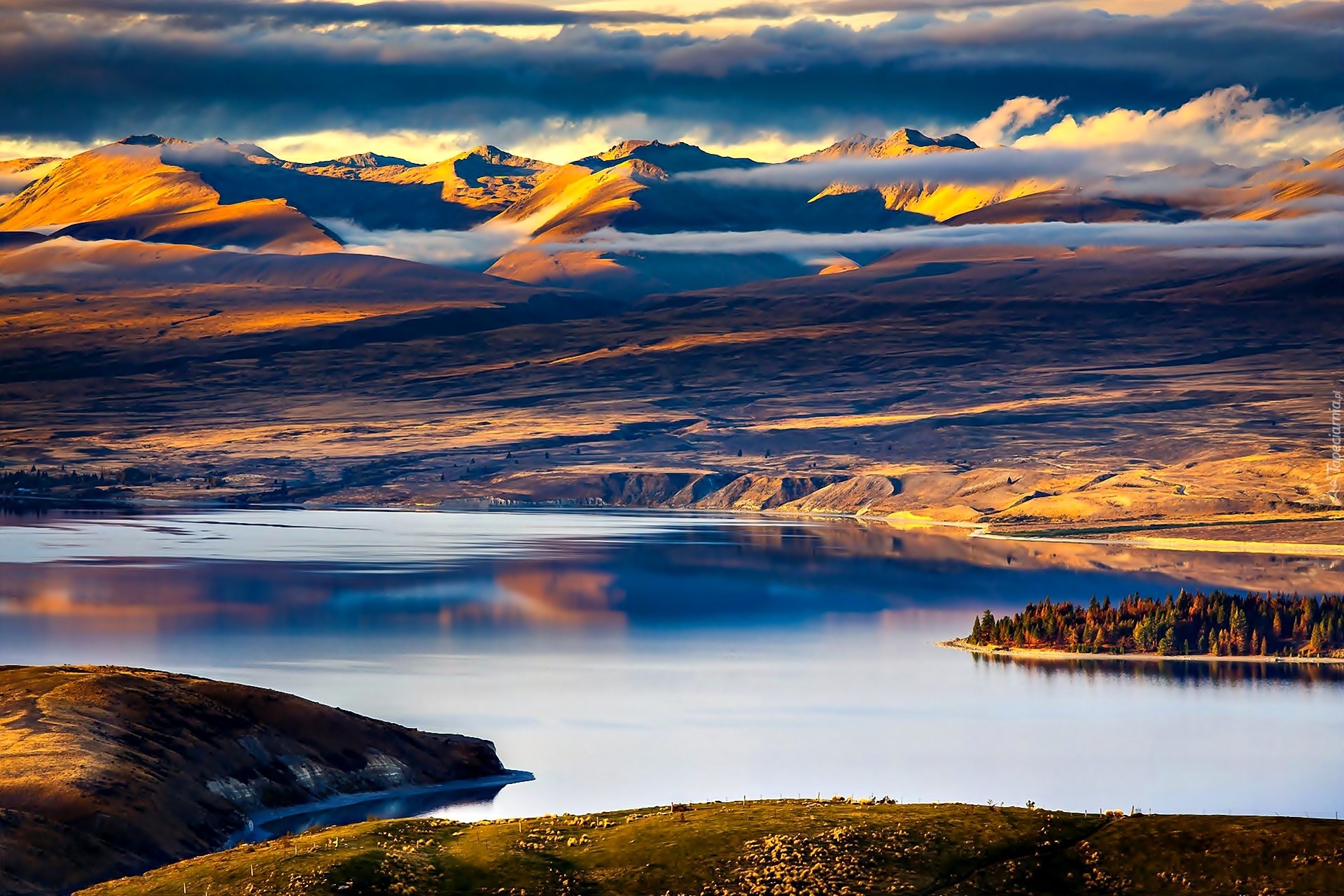 Edytor tapety: Jezioro, Góry, Wyspa, Drzewa, Zachód Słońca
