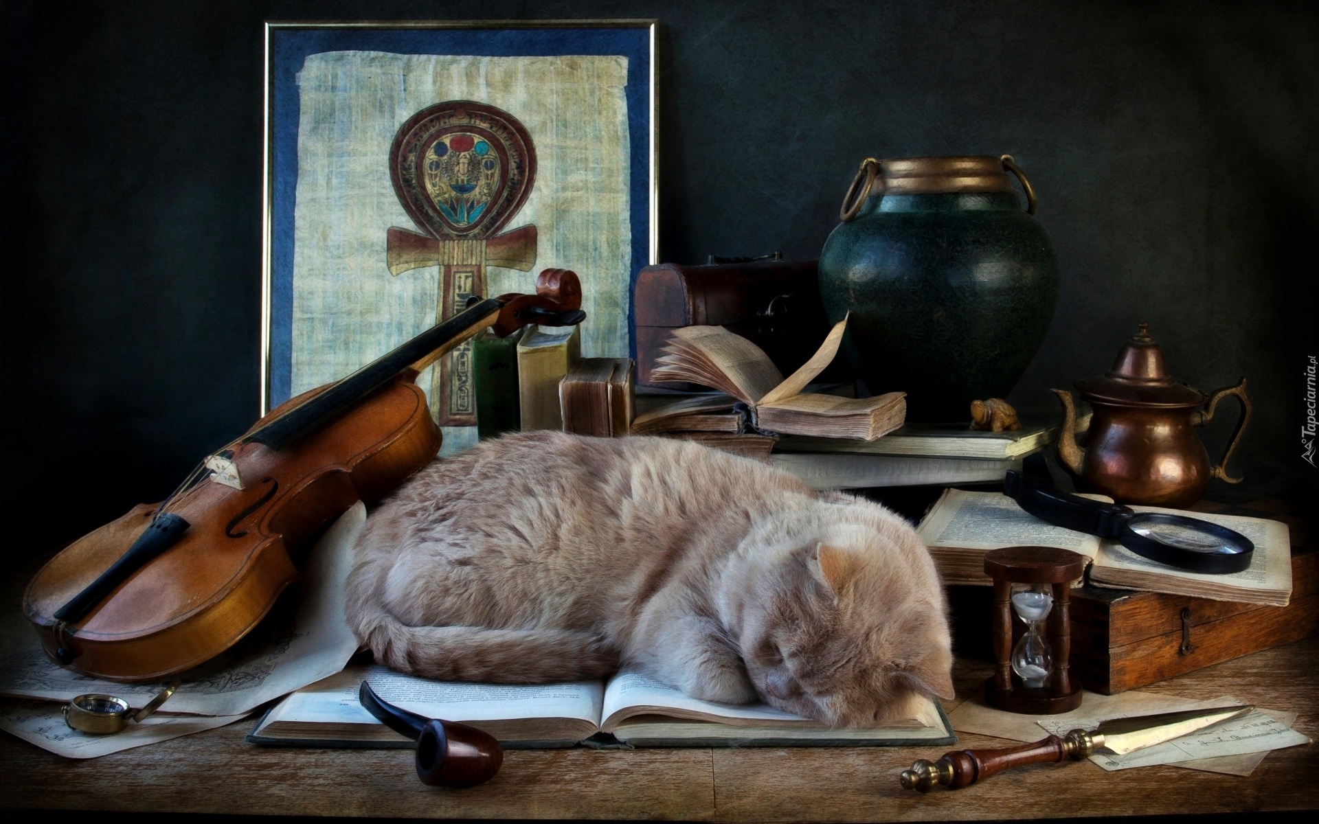 Edytor tapety: Kot, Książka, Fajka, Skrzypce