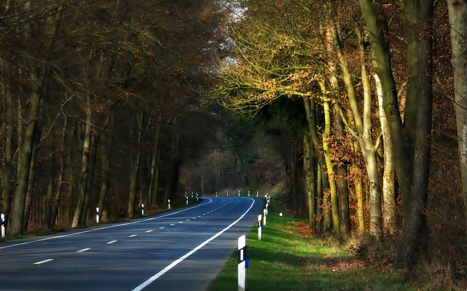 Edytor tapety: Droga, Zakręt, Las, Drzewa, Przebijające Światło