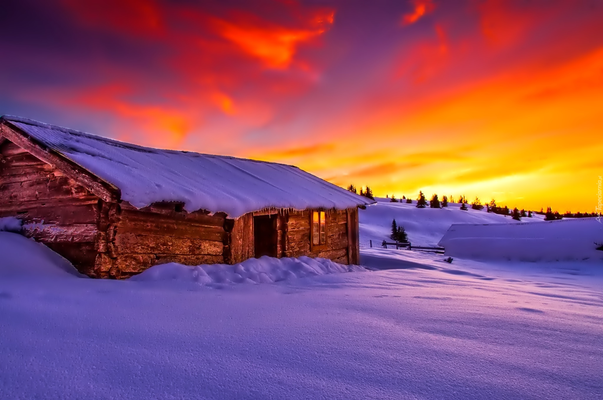 Edytor tapety: Dom, Zima, Zachód Słońca