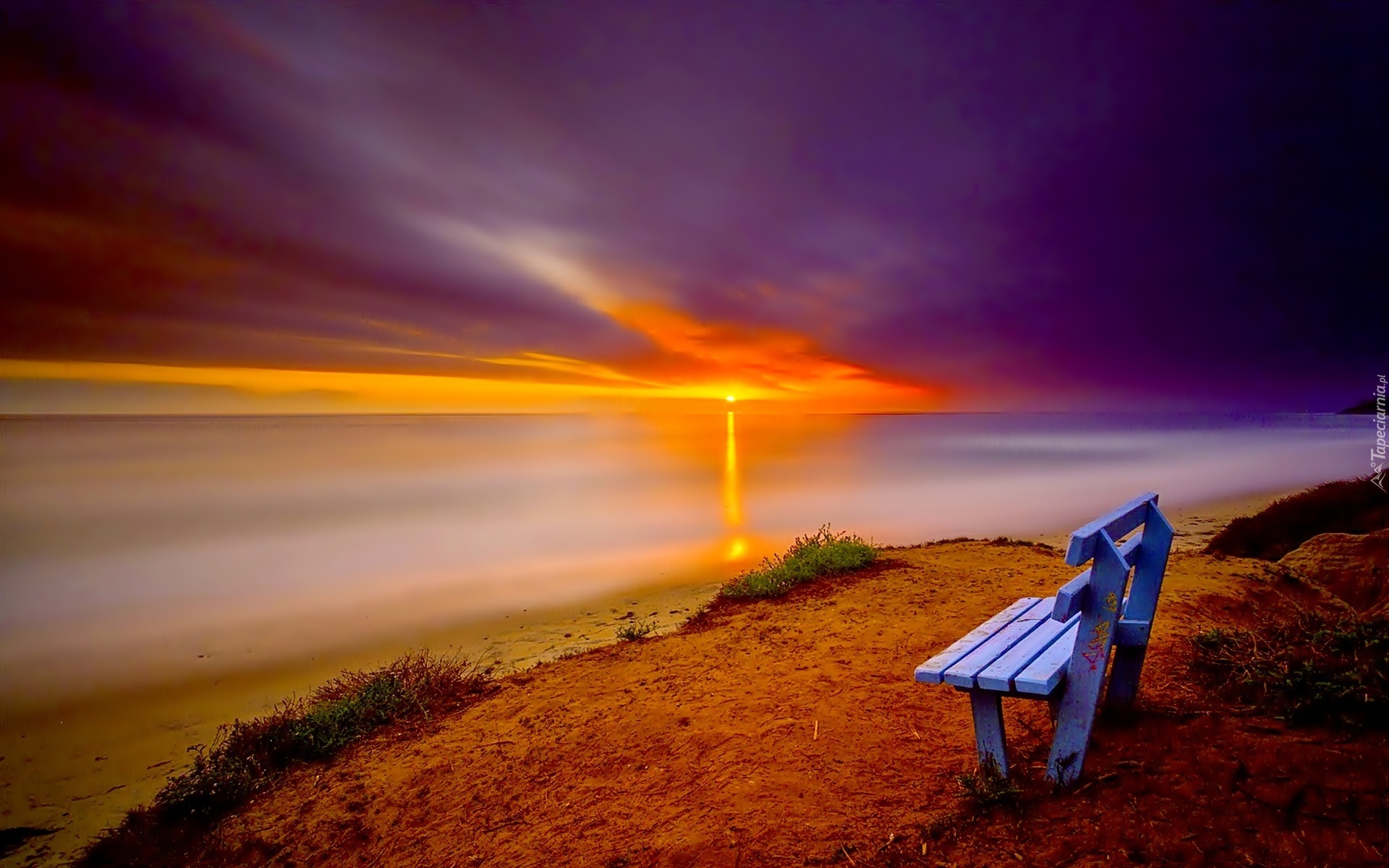 Edytor tapety: Jezioro, Zachód Słońca, Ławka