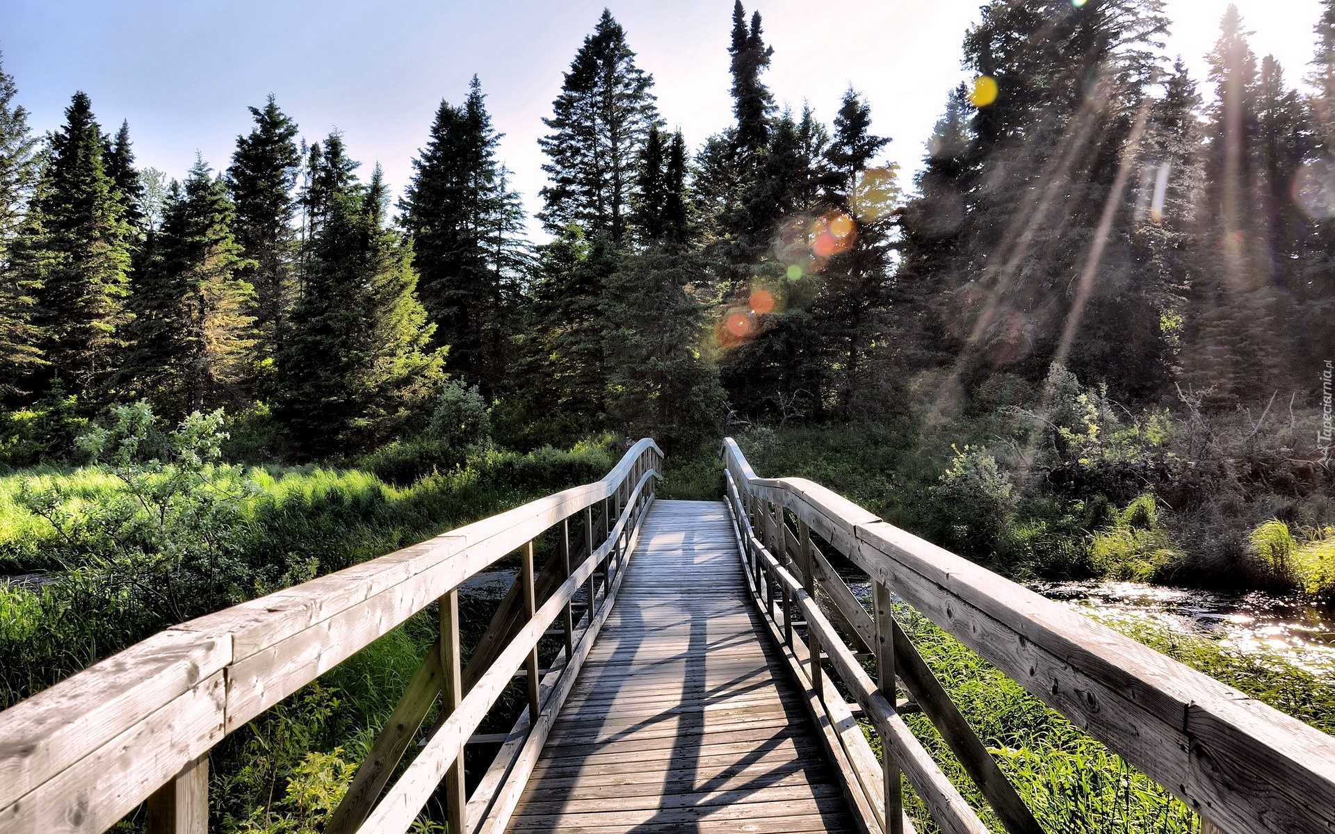 Edytor tapety: Drewniany, Most, Rzeczka, Poranek, Promienie, Słońca