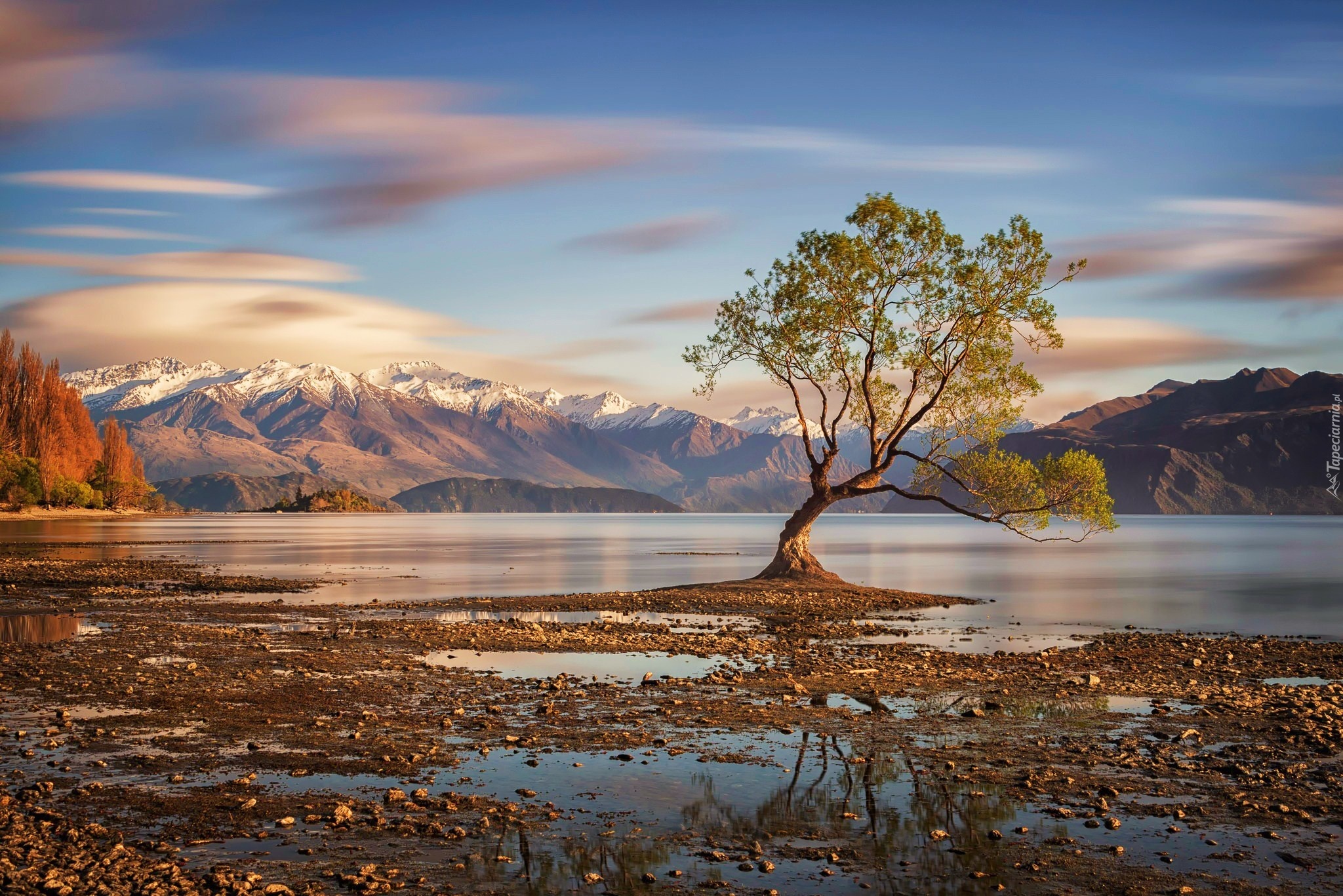 Edytor tapety: Drzewo, Jezioro, Góry, Chmury