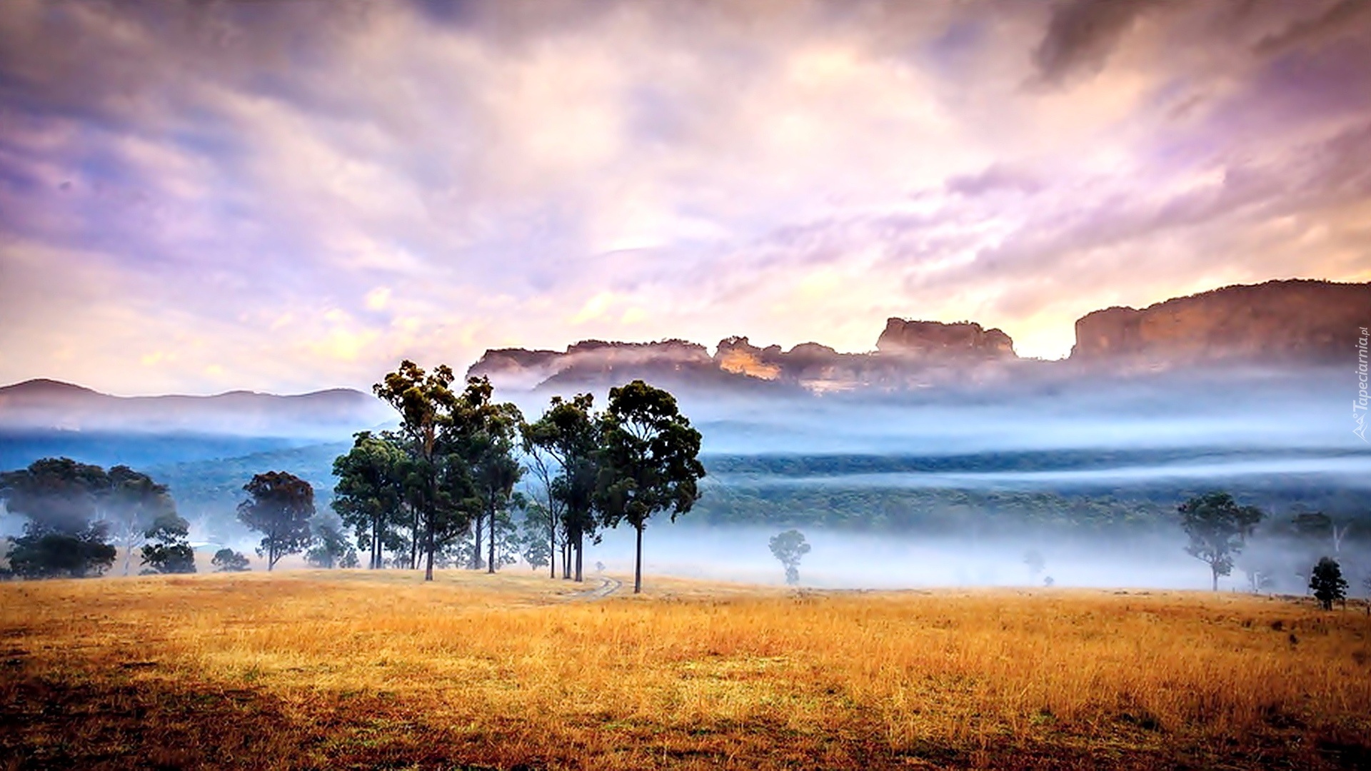 Edytor tapety: Góry, Pole, Drzewa, Mgła