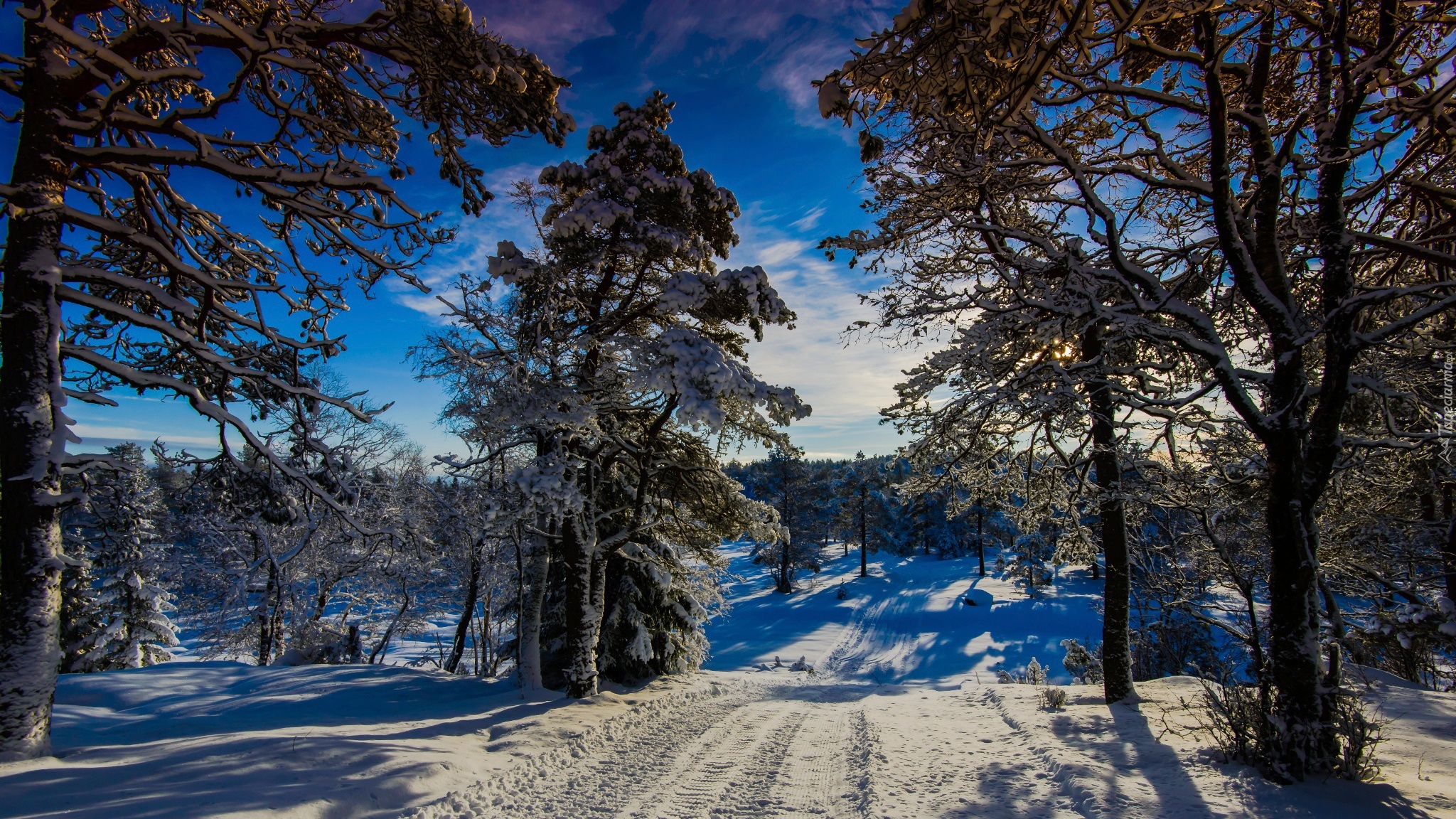 Edytor tapety: Zima, Droga, Drzewa, Wonderland, Norwegia, Zimowe, Słońce