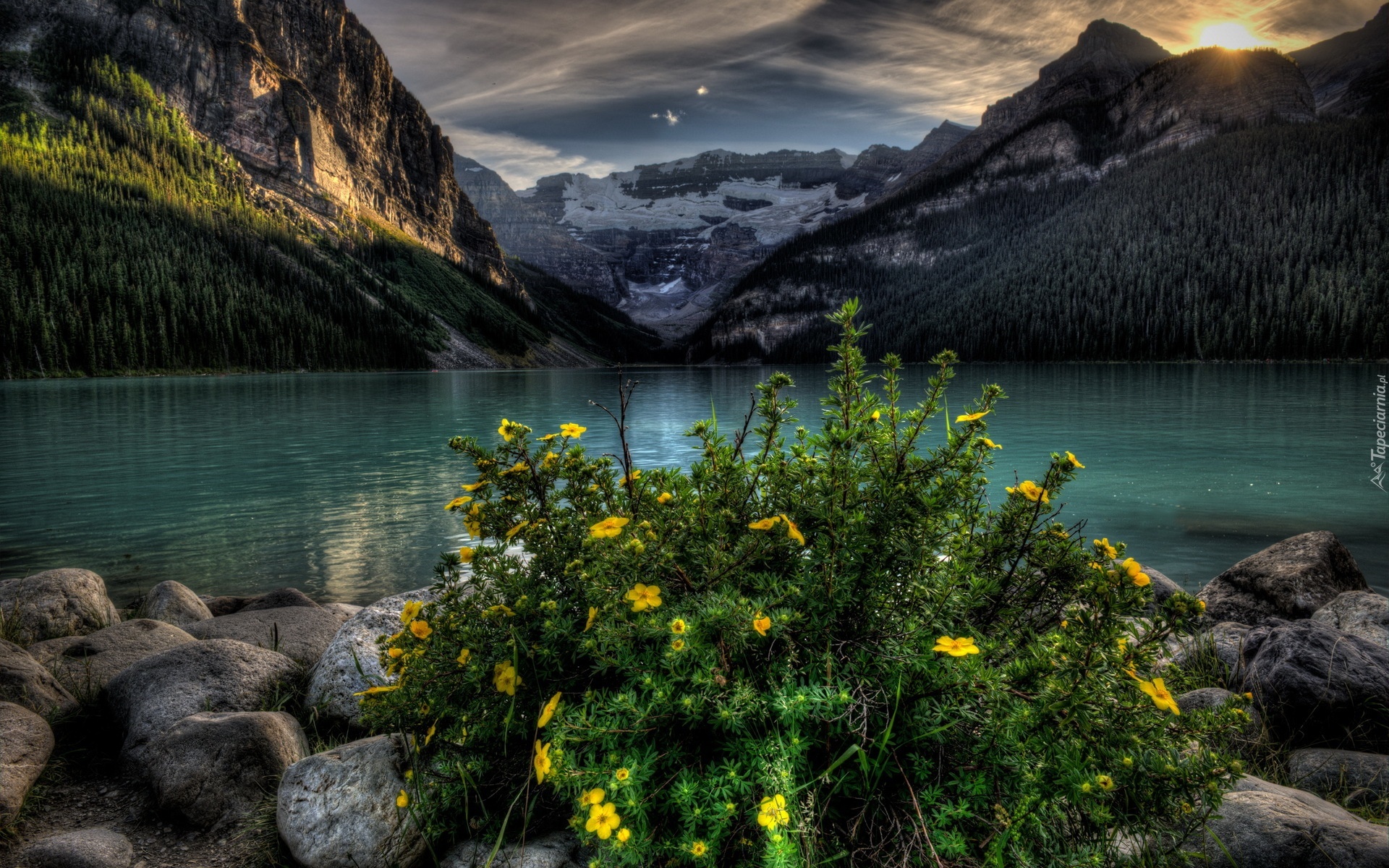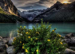 Edytor tapety: Góry, Jezioro, Kamienie, Kwiaty