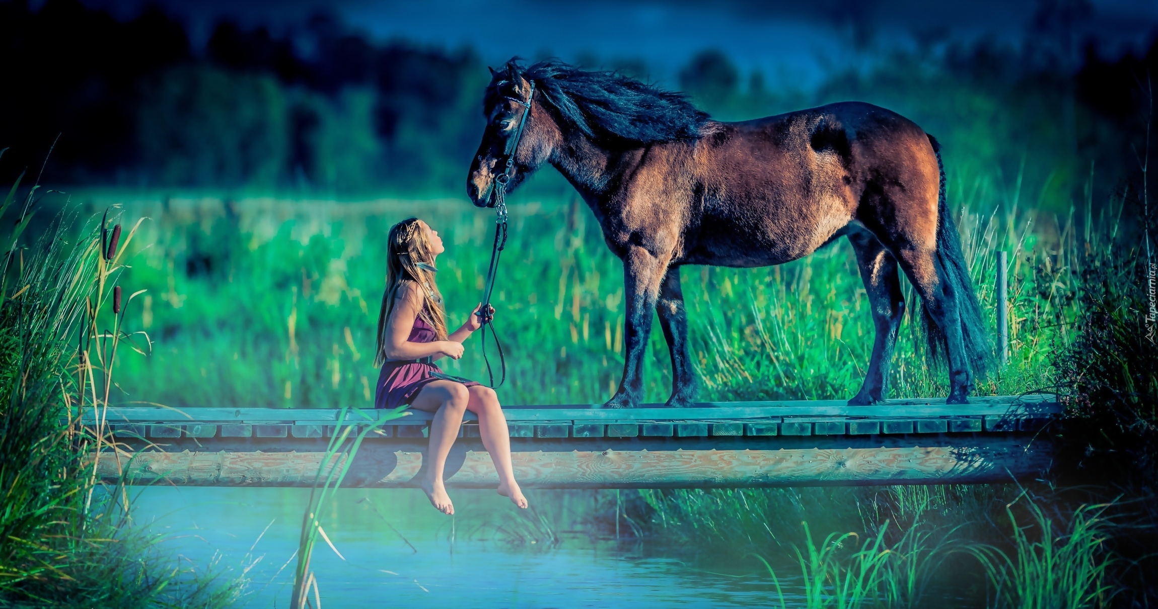 Edytor tapety: Dziewczyna, Koń, Rzeka, Trawy, Kładka
