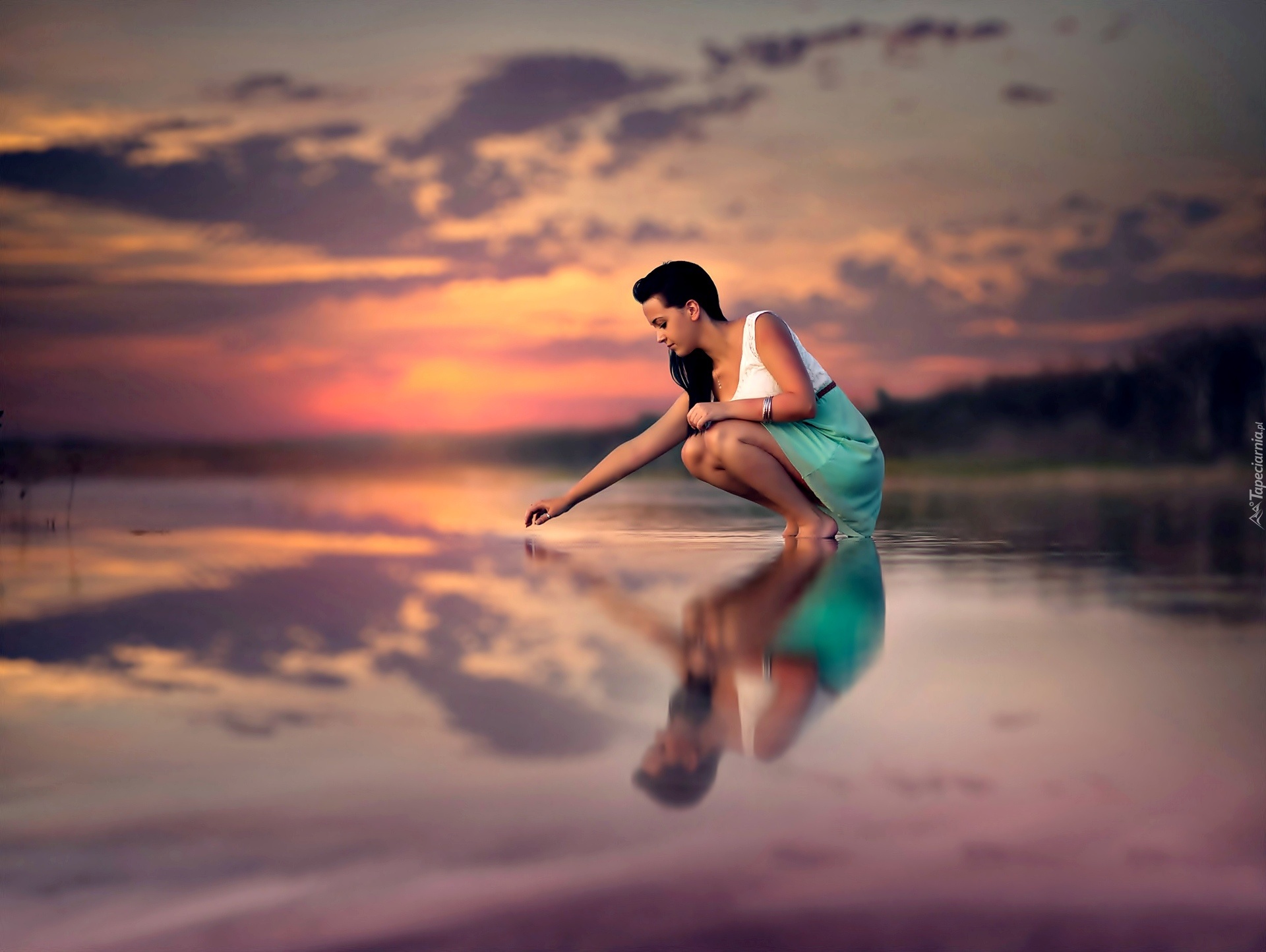 Edytor tapety: Jezioro, Zachód Słońca, Kobieta, Odbicie