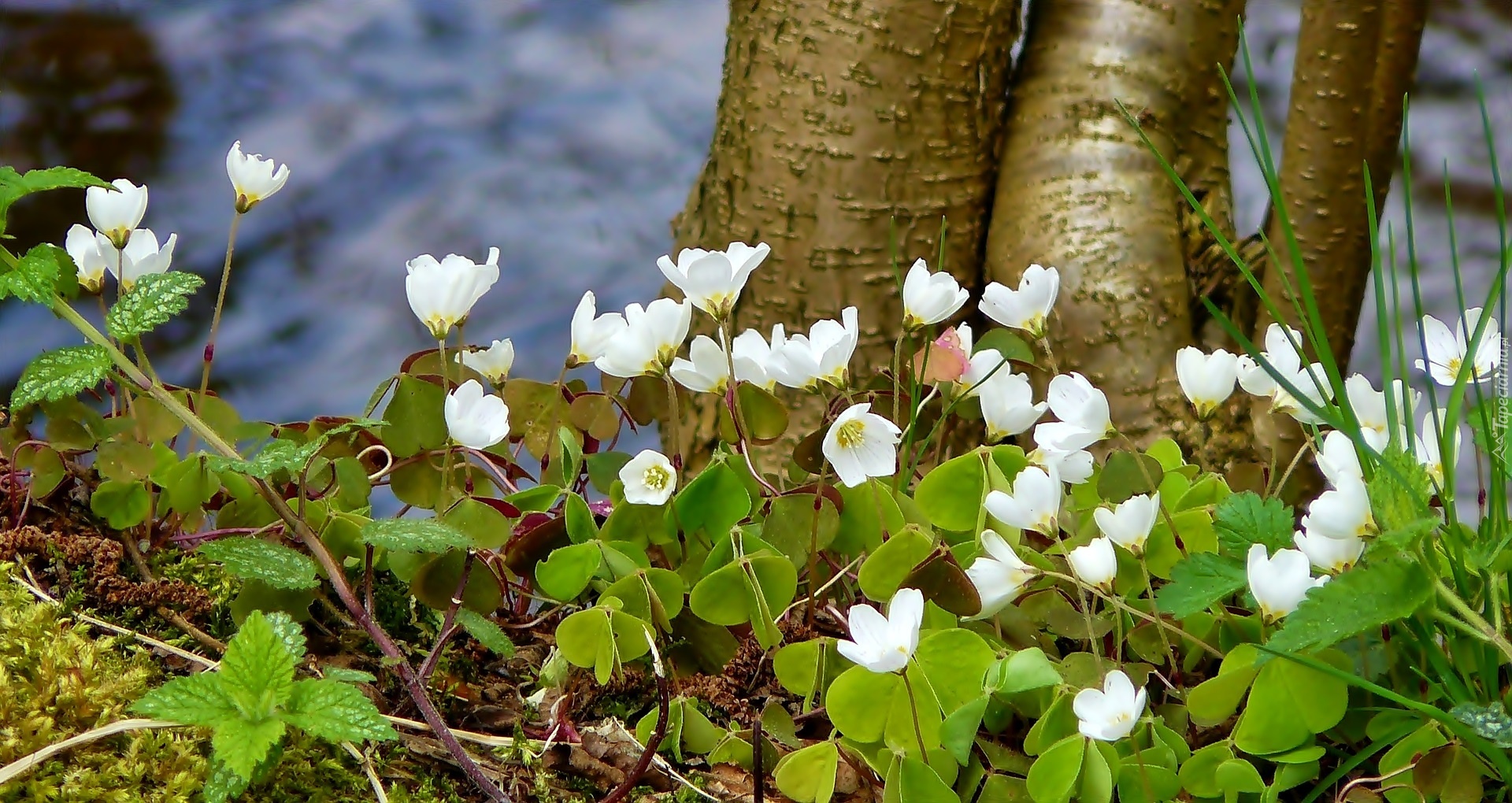 Edytor tapety: Białe, Kwiatki, Zawilec Gajowy, Pnie, Drzewa