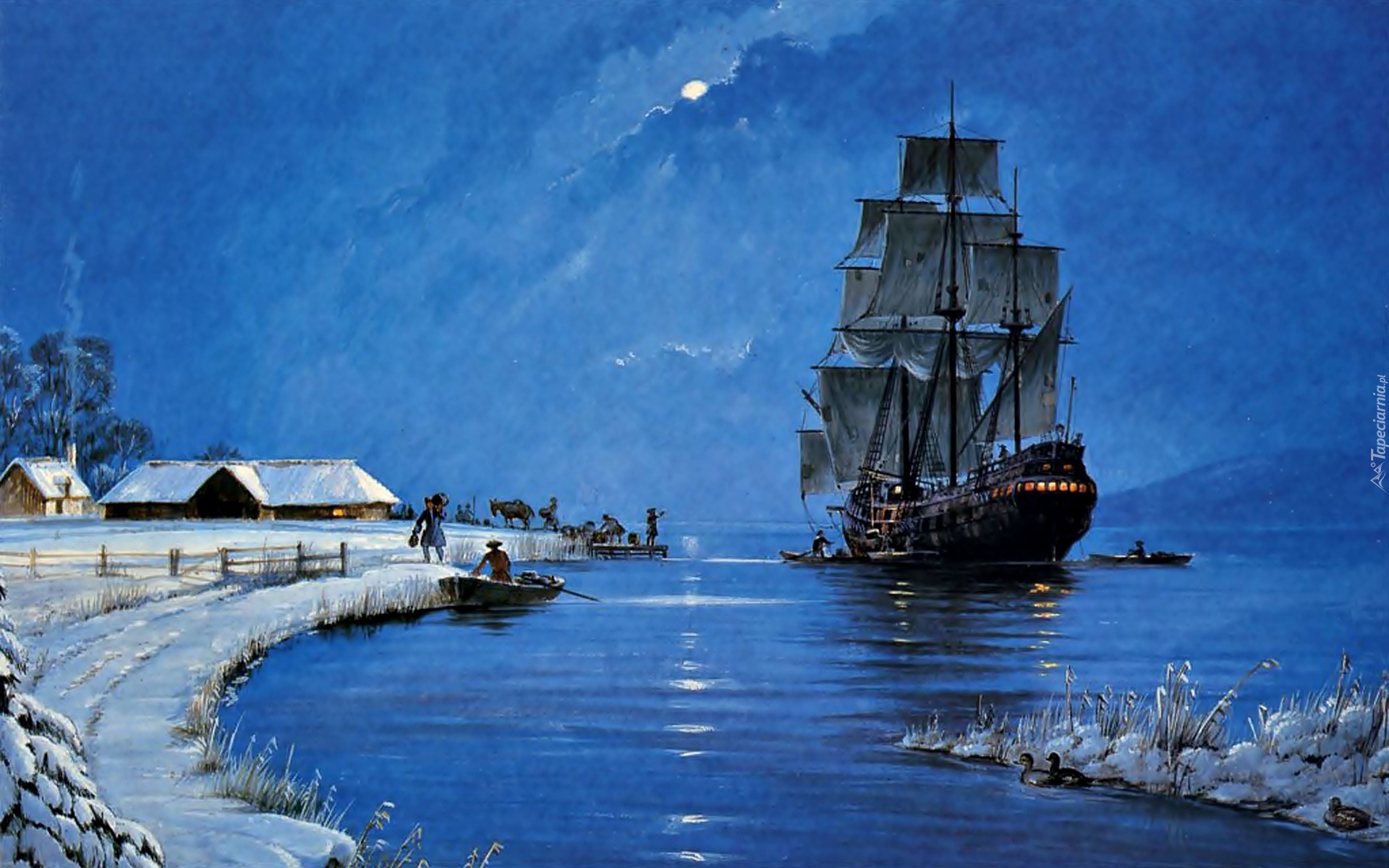 Edytor tapety: Morze, Statek, Domy, Brzeg, Noc, Obraz, Zima