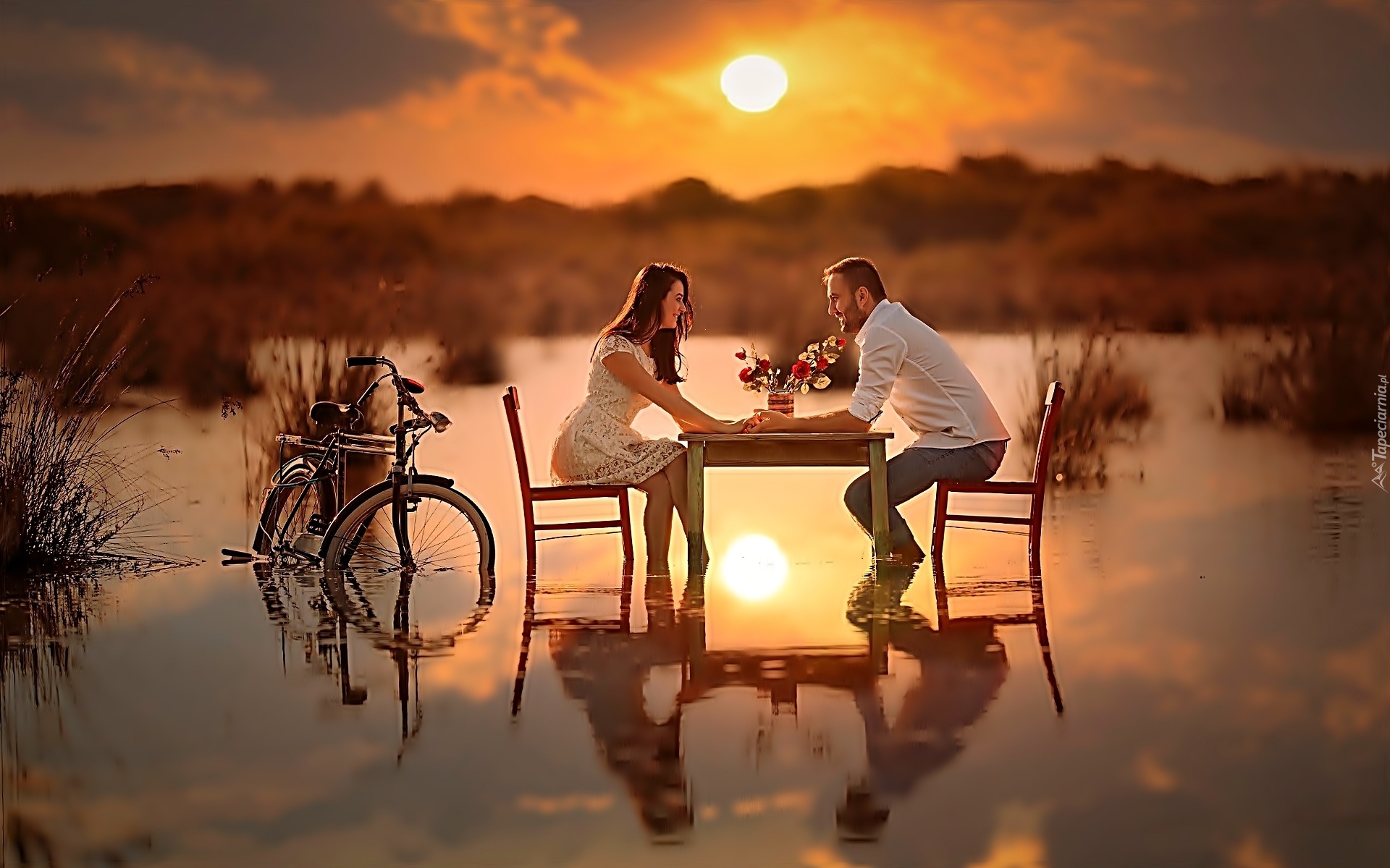 Edytor tapety: Rozlewisko, Kobieta, Mężczyzna, Rower, Stół, Krzesła, Zachód słońca