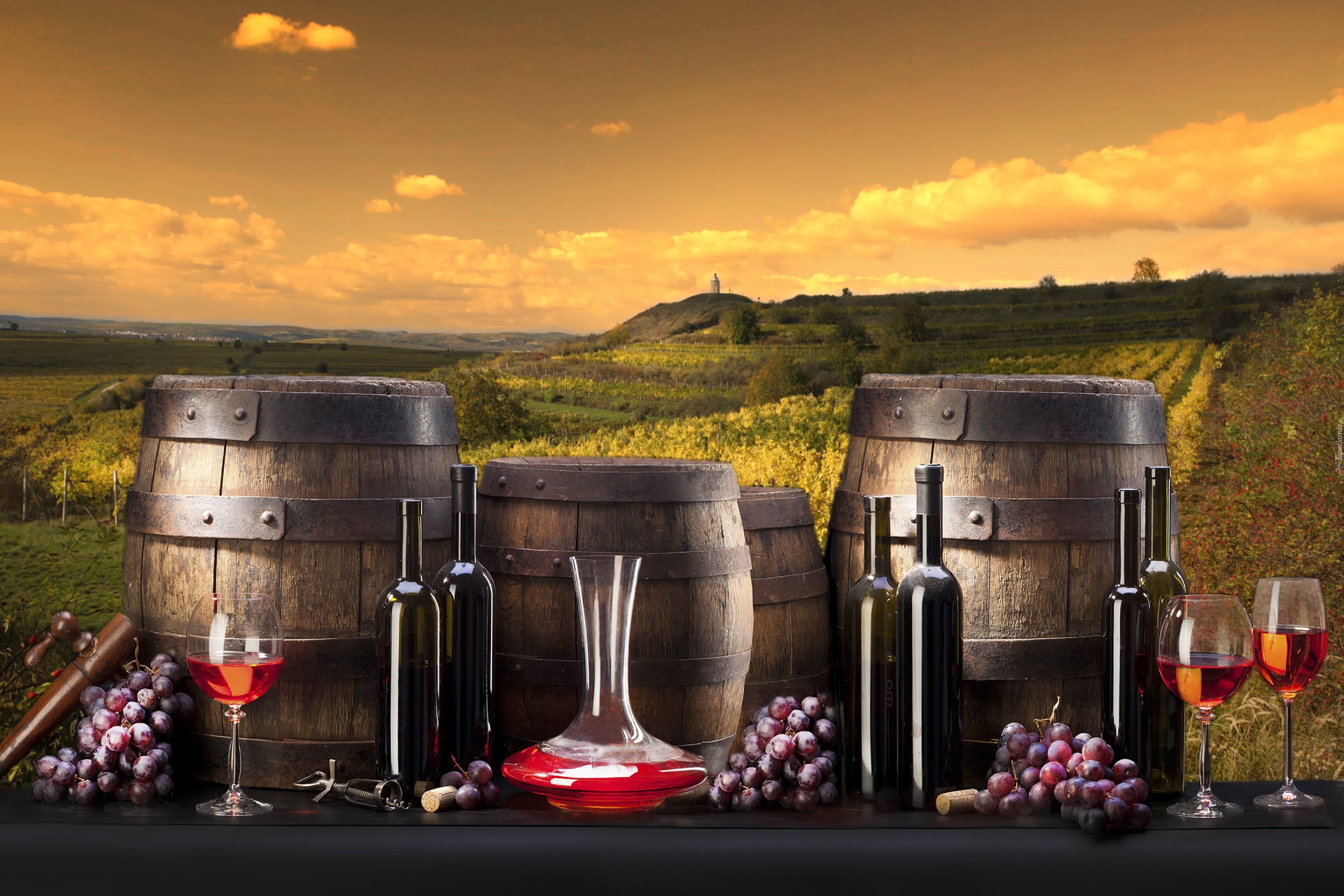 Edytor tapety: Wina, Winogrona, Kieliszki, Beczki, Winnica, Zachód Słońca