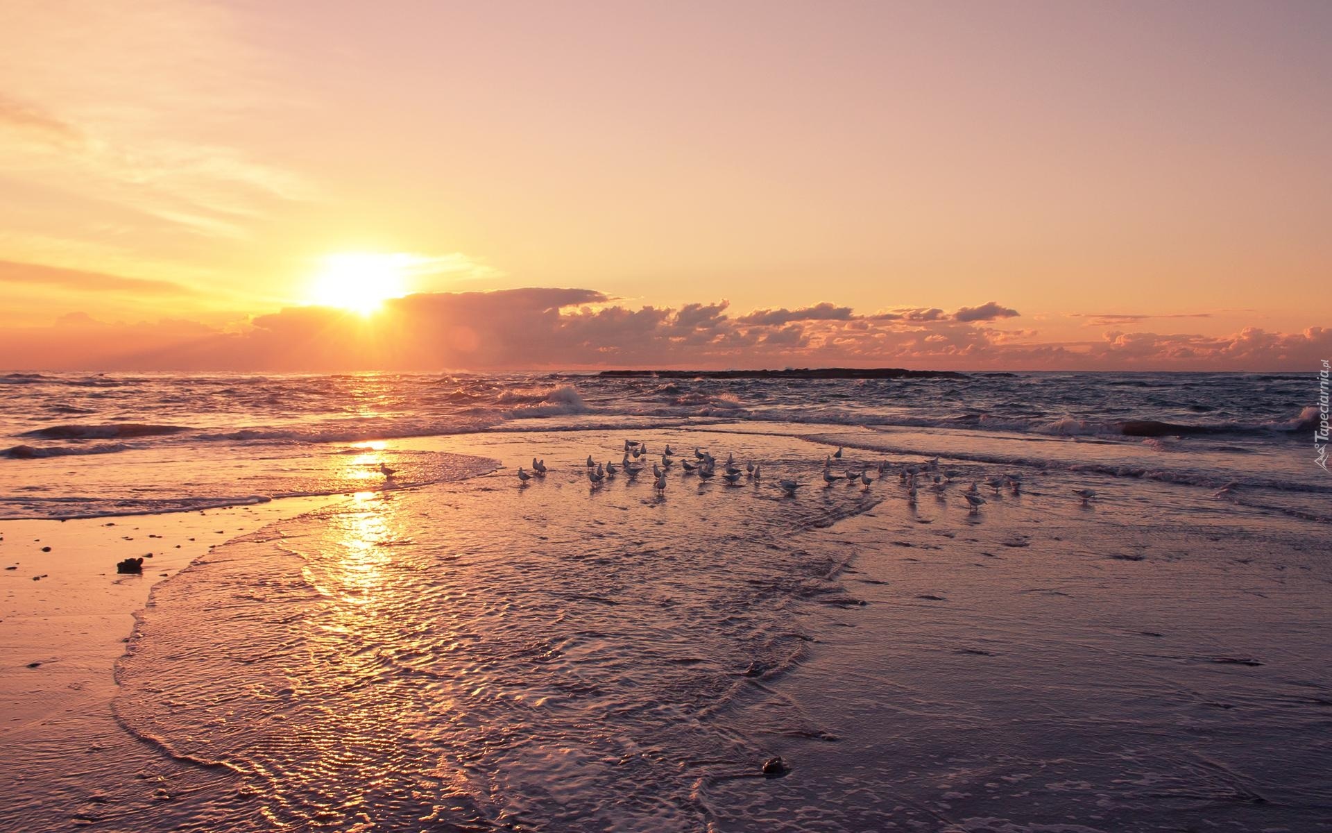 Edytor tapety: Zachód Słońca, Morze, Plaża, Mewy, Ptaki