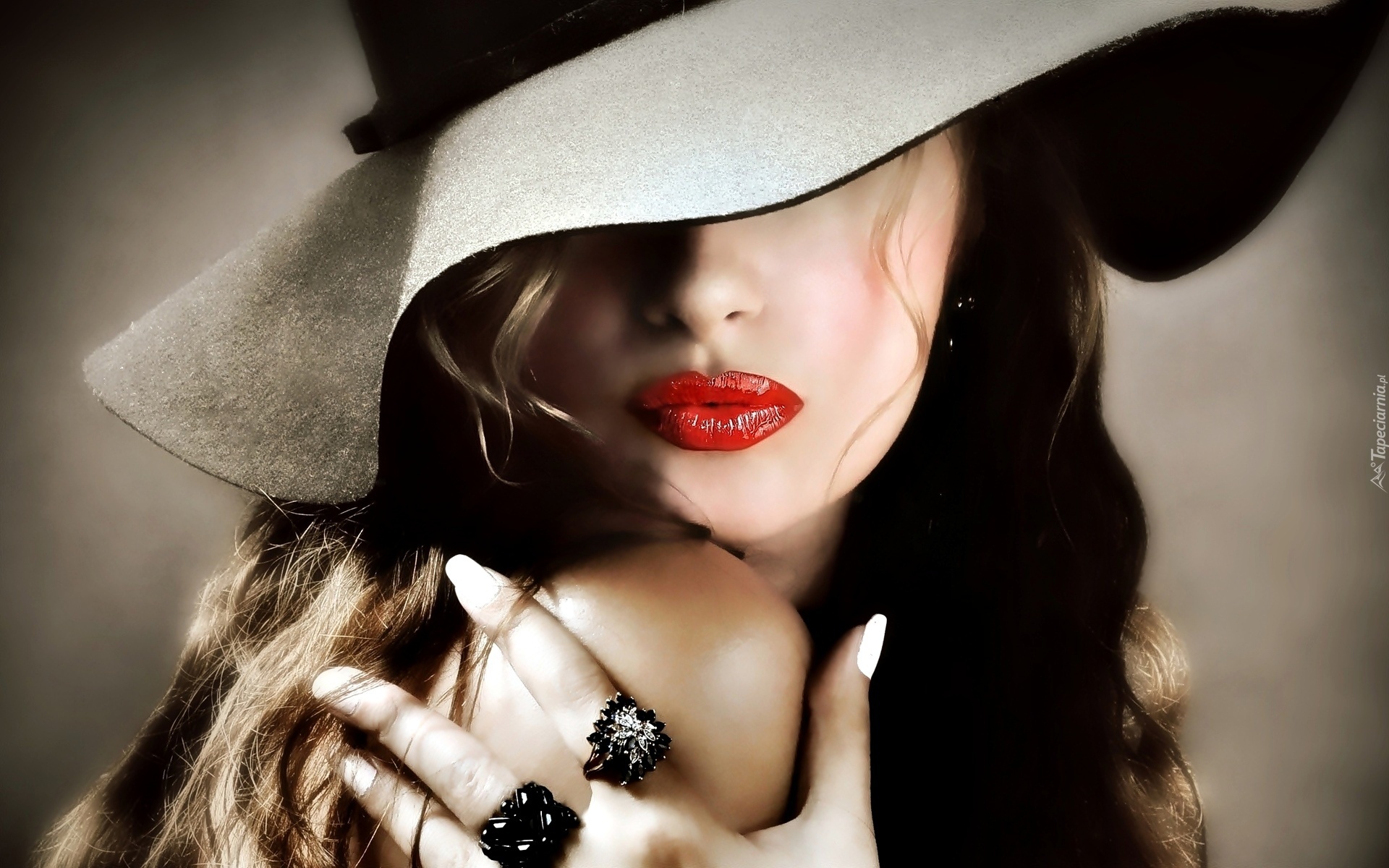 Edytor tapety: Kobieta, Pomalowane, Usta, Kapelusz, Pierścionki