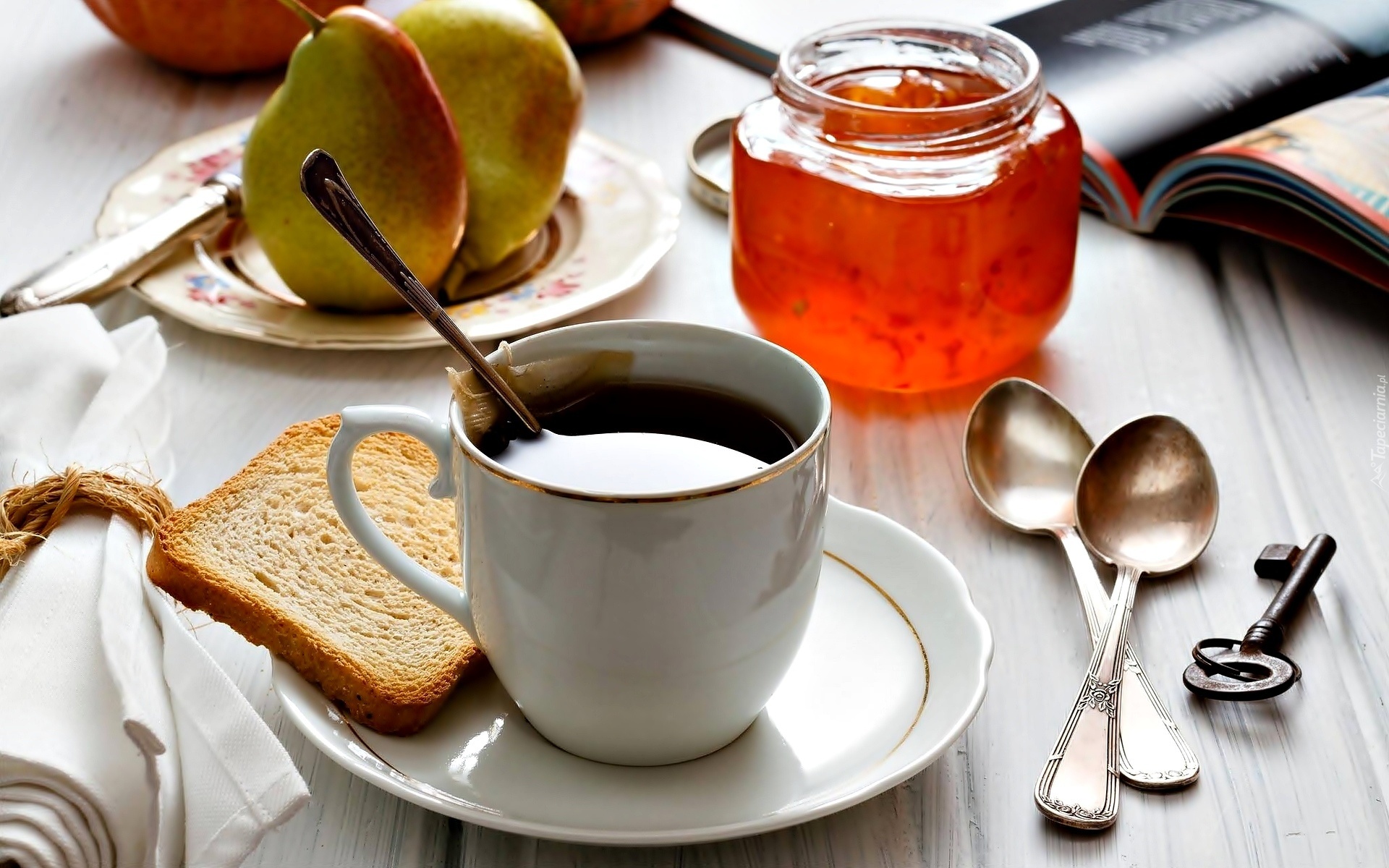 Edytor tapety: Tost, Dżem, Herbata, Gruszki, Łyżeczki, Klucz
