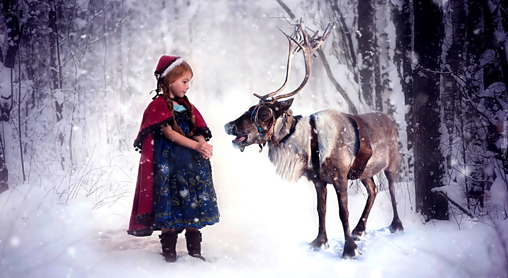Edytor tapety: Dziecko, Las, Zima, Renifer