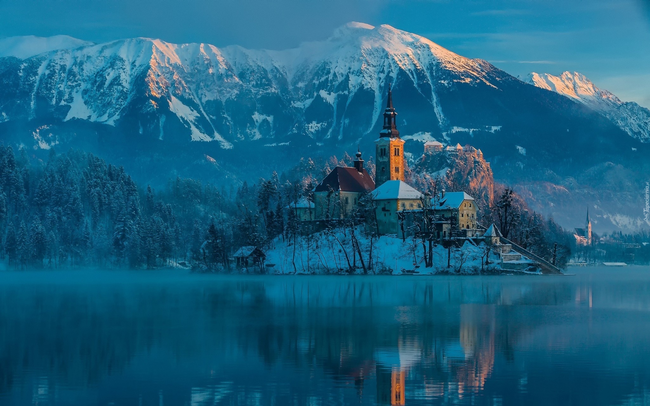 Edytor tapety: Domy, Kościół, Zima, Góry, Jezioro, Bled, Słowenia