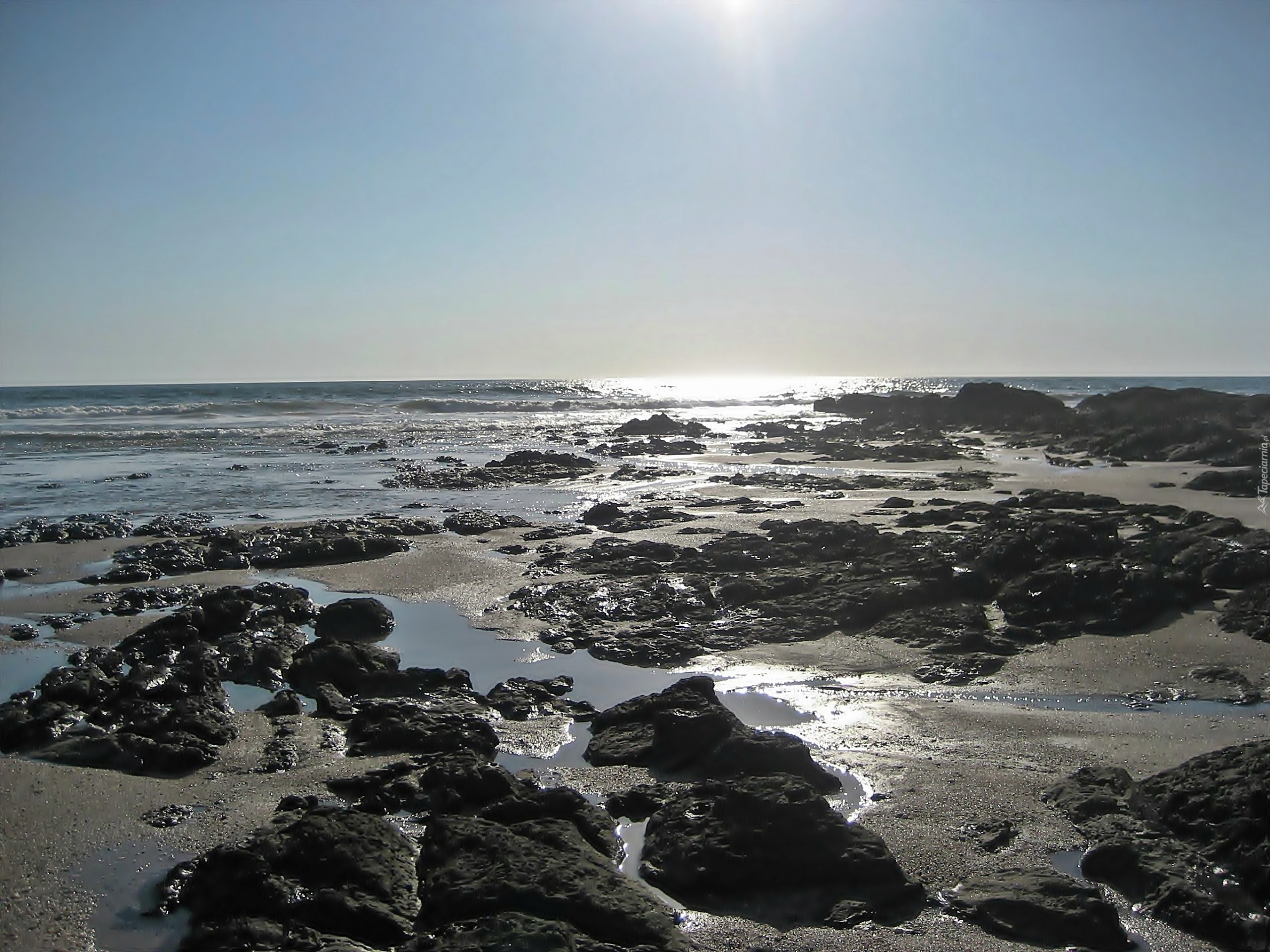 Edytor tapety: Plaża, Kamienie, Morze, Niebo, Promienie Słońca