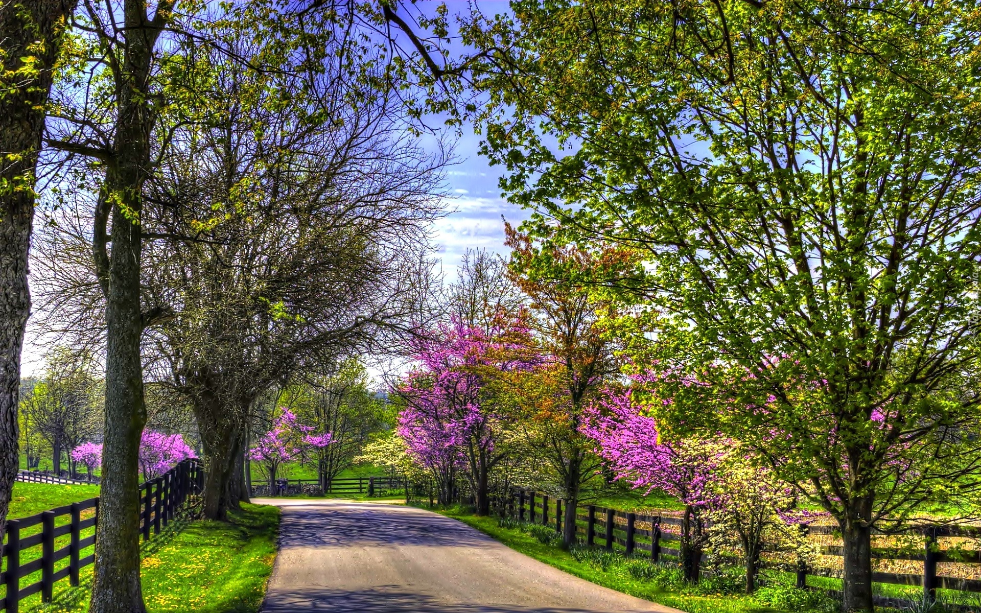 Edytor tapety: Wiosna, Droga, Kwitnące, Drzewa, Ogrodzenie