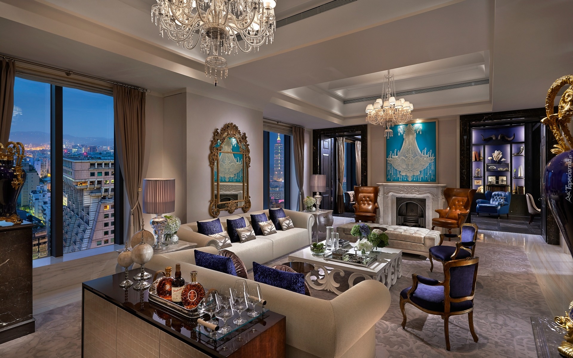 Edytor tapety: Salon, Okna, Kominek