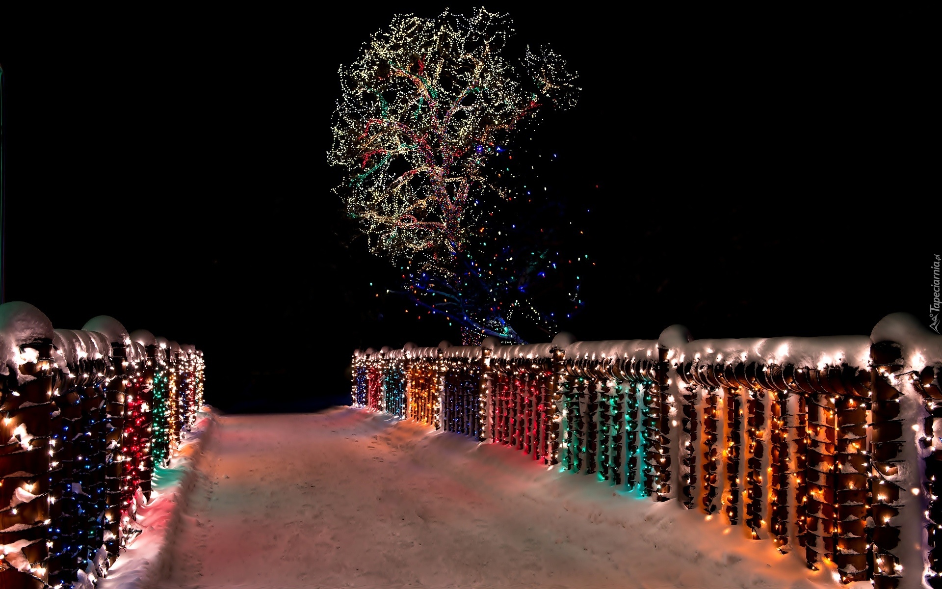 Edytor tapety: Zima, Śnieg, Most, Światełka, Drzewo