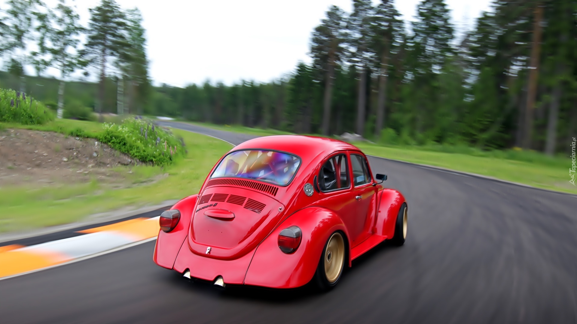 Edytor tapety: Czerwony, Volkswagen, Garbus, Droga, Las