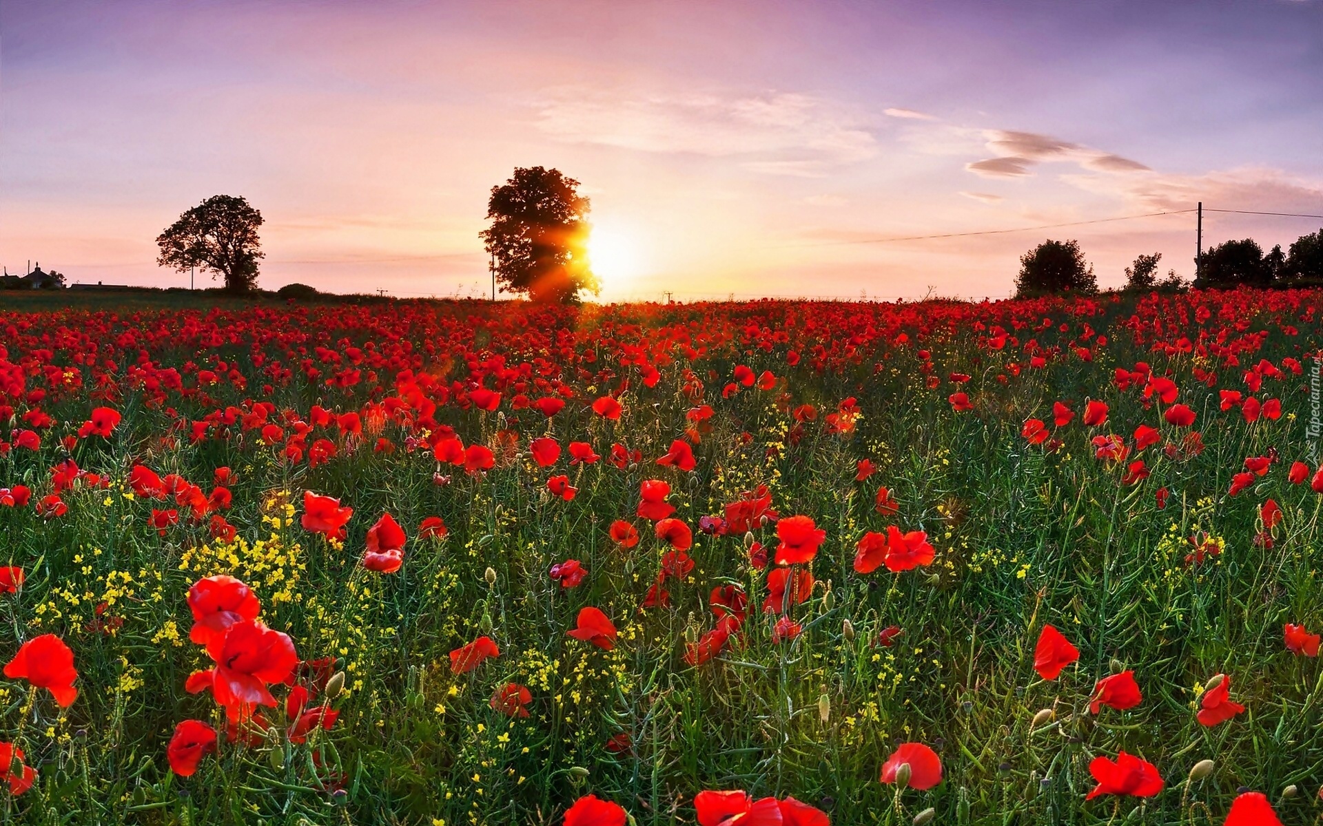 Edytor tapety: Łąka, Maki, Drzewa, Wschód, Słońca