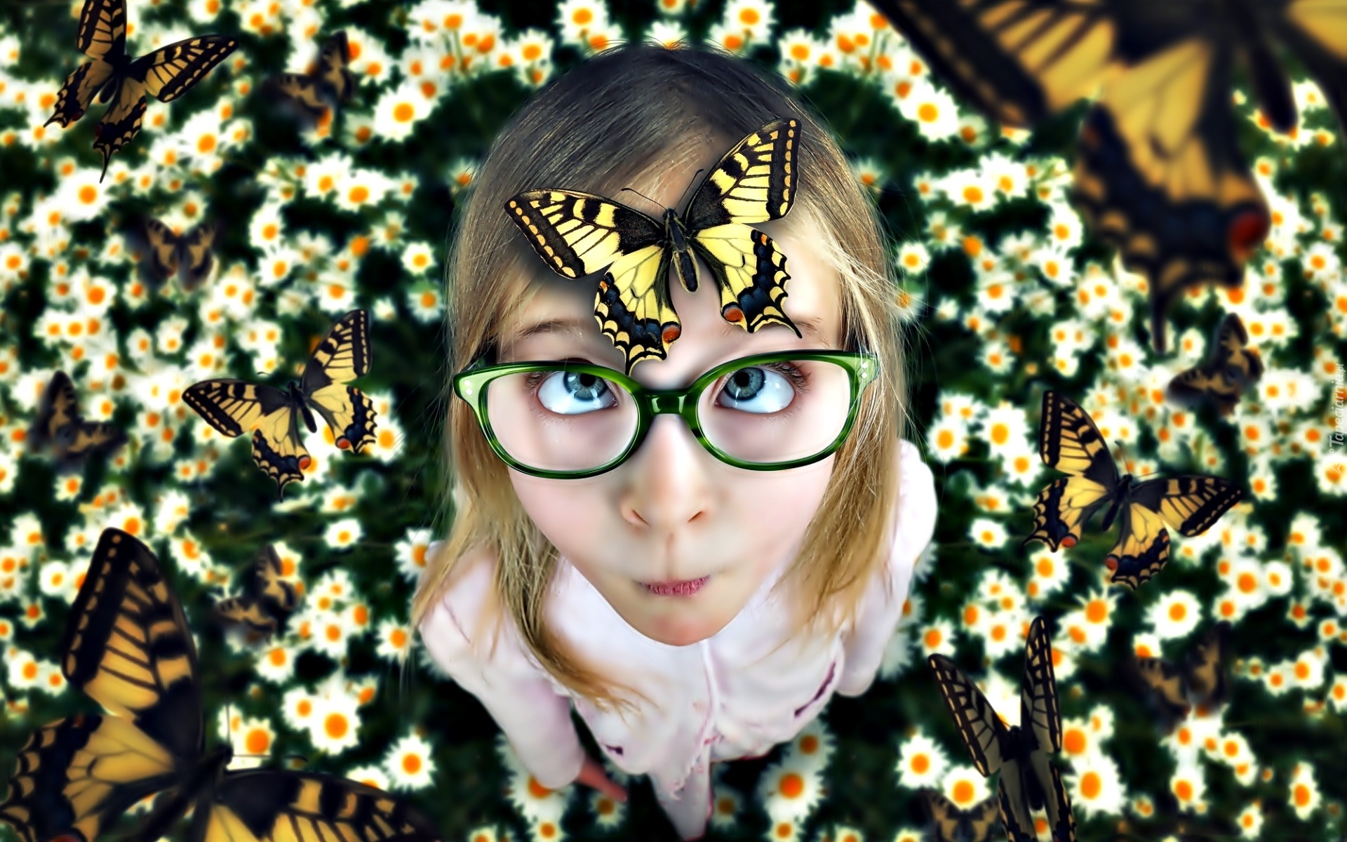 Edytor tapety: Dziewczynka, Twarz, Mina, Okulary, Motyle, Rumianek