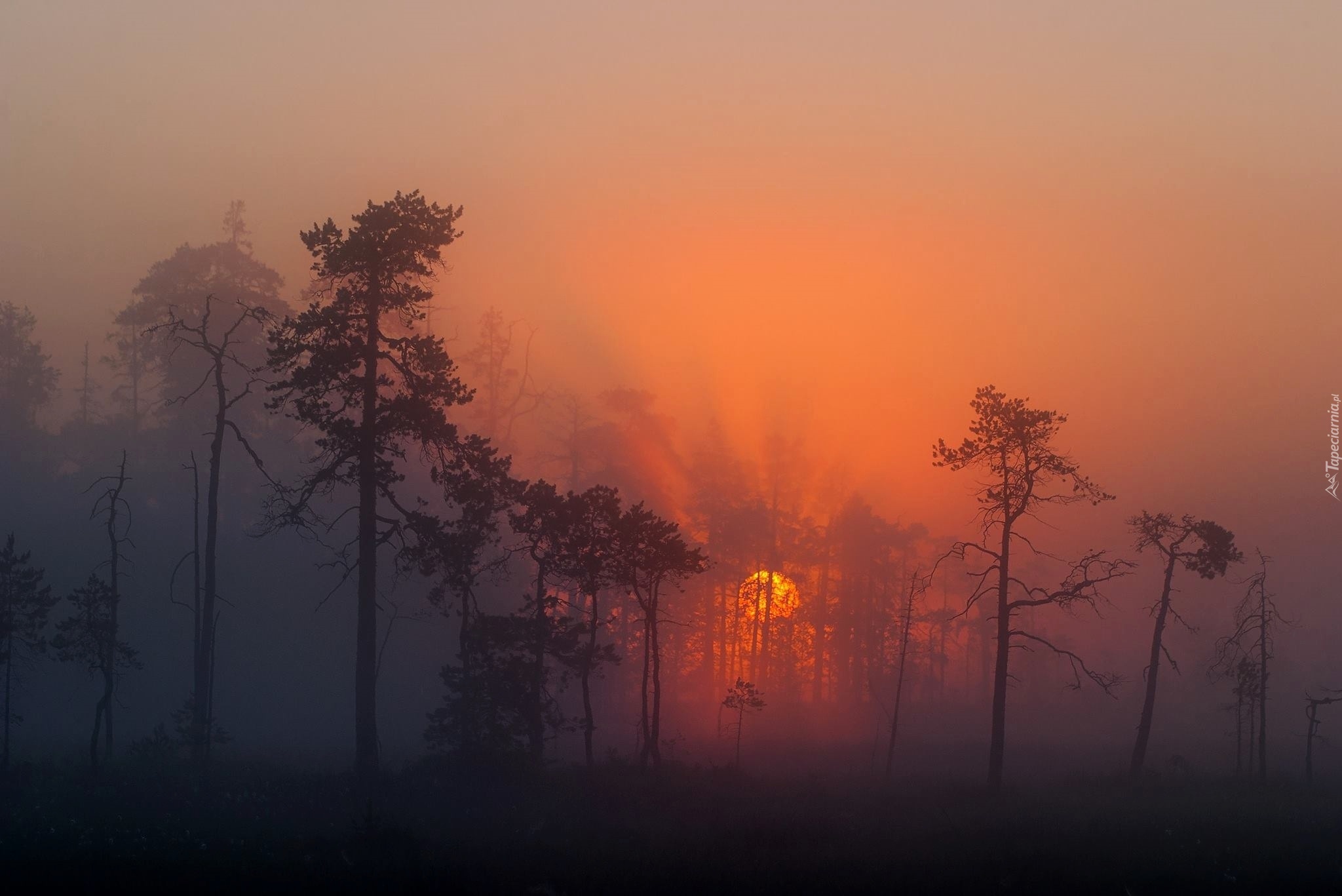 Edytor tapety: Wschód, Słońca, Mgła, Drzewa