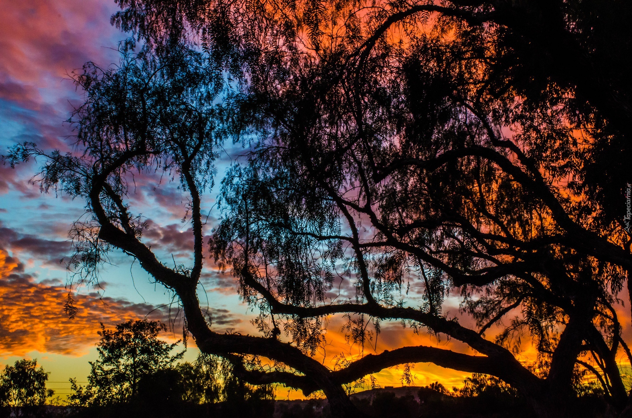 Edytor tapety: Zachód słońca, Chmury, Drzewa