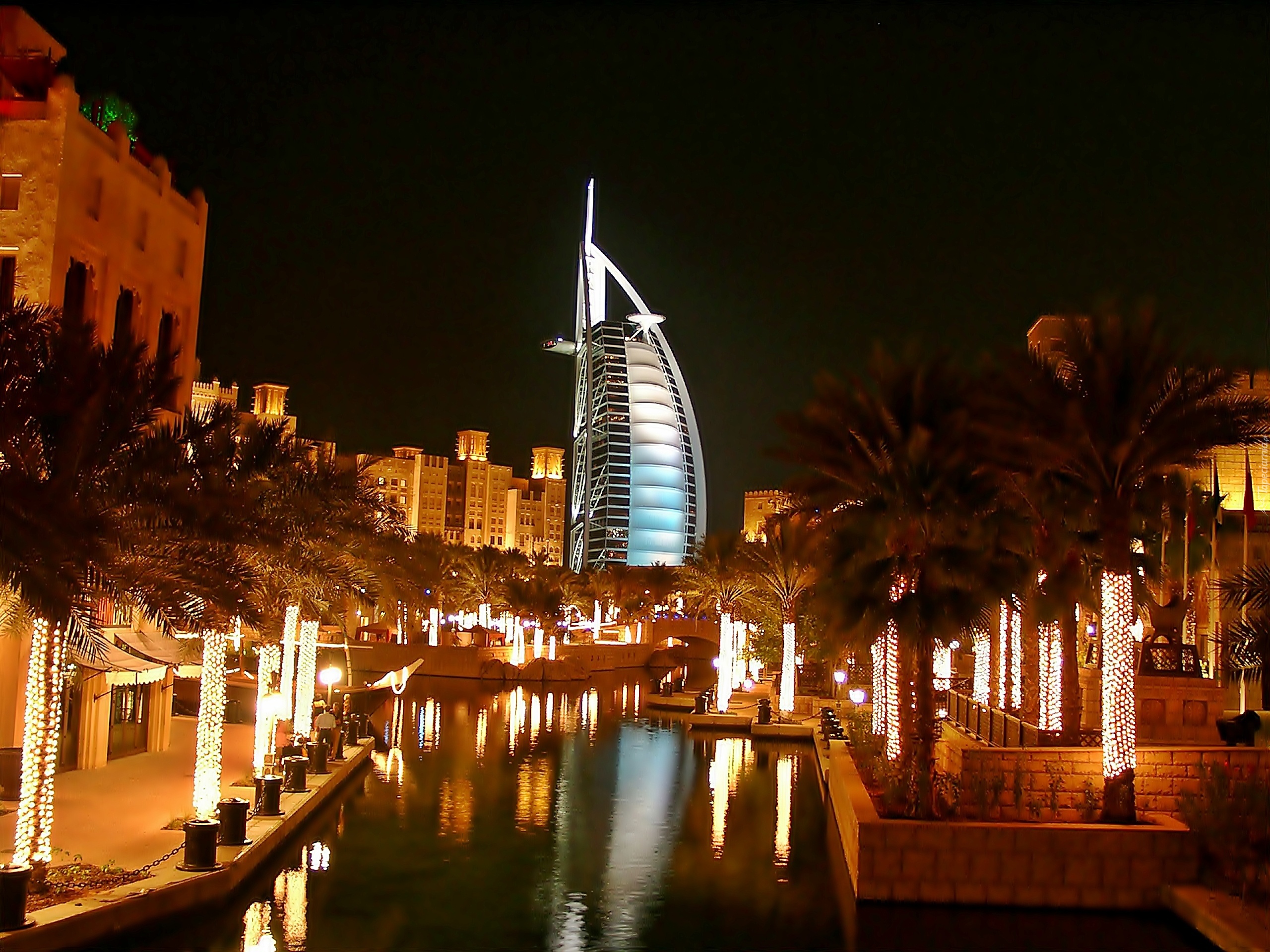 Edytor tapety: Zjednoczone Emiraty Arabskie, Dubaj, Hotel, Burdż al-Arab, Budynki, Palmy, Miasto Nocą