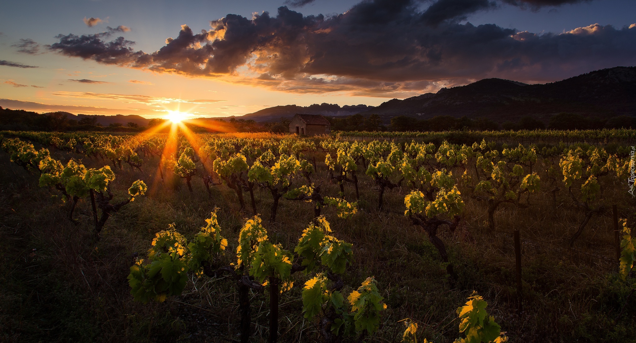 Edytor tapety: Zachód słońca, Promienie, Winnica