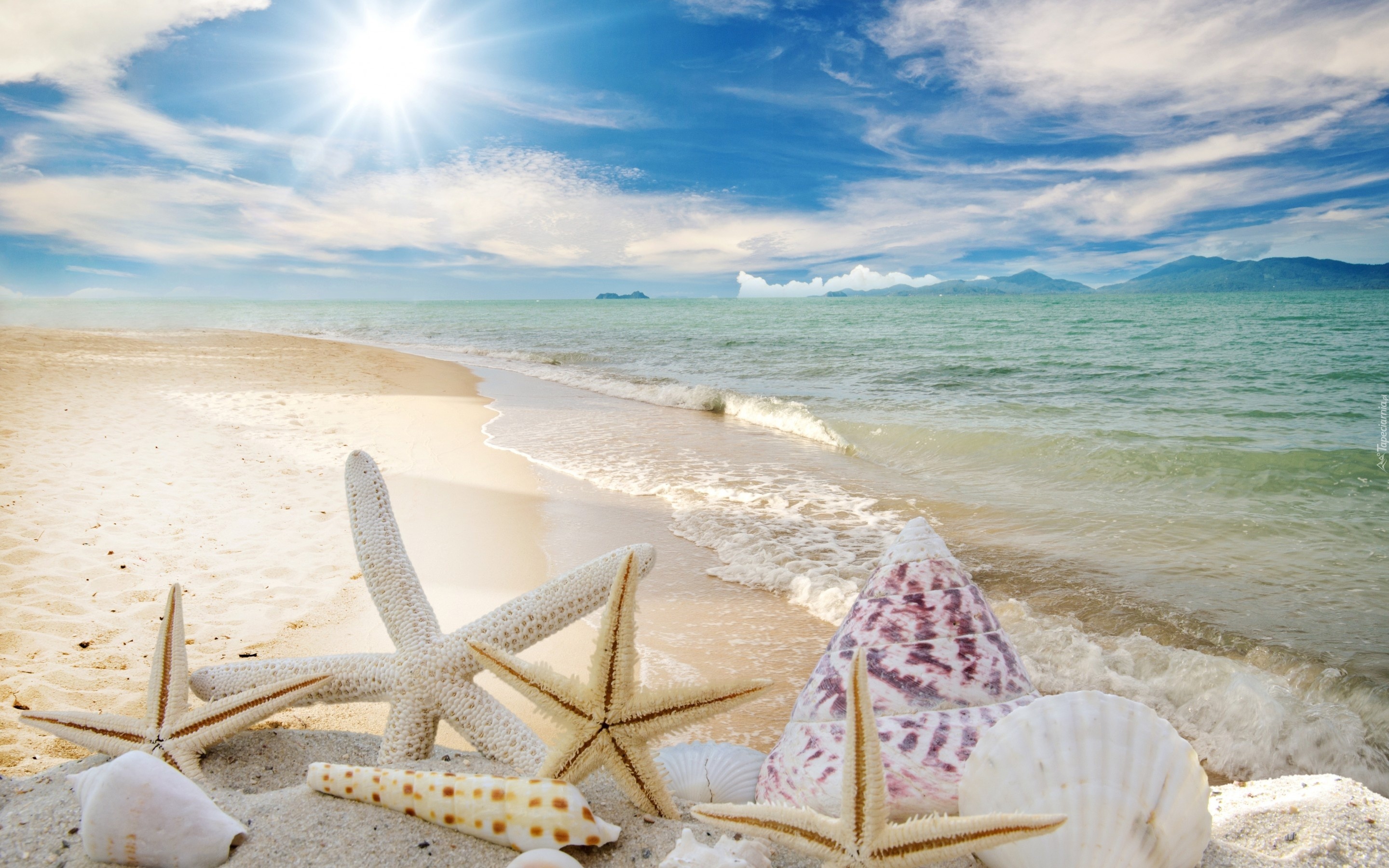 Edytor tapety: Muszelki, Niebo, Morze, Plaża, Lato