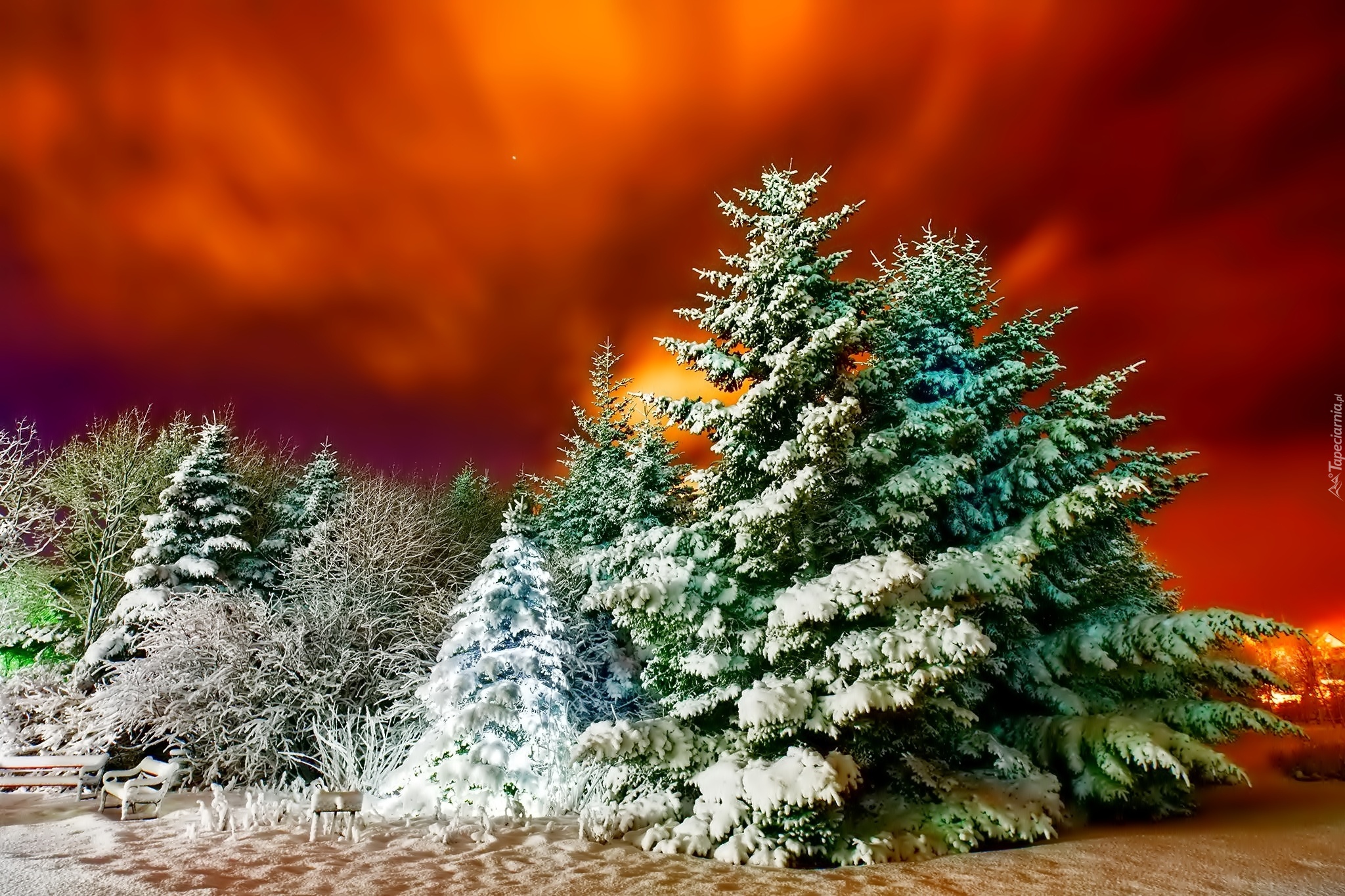 Edytor tapety: Zima, Zachód Słońca, Drzewa