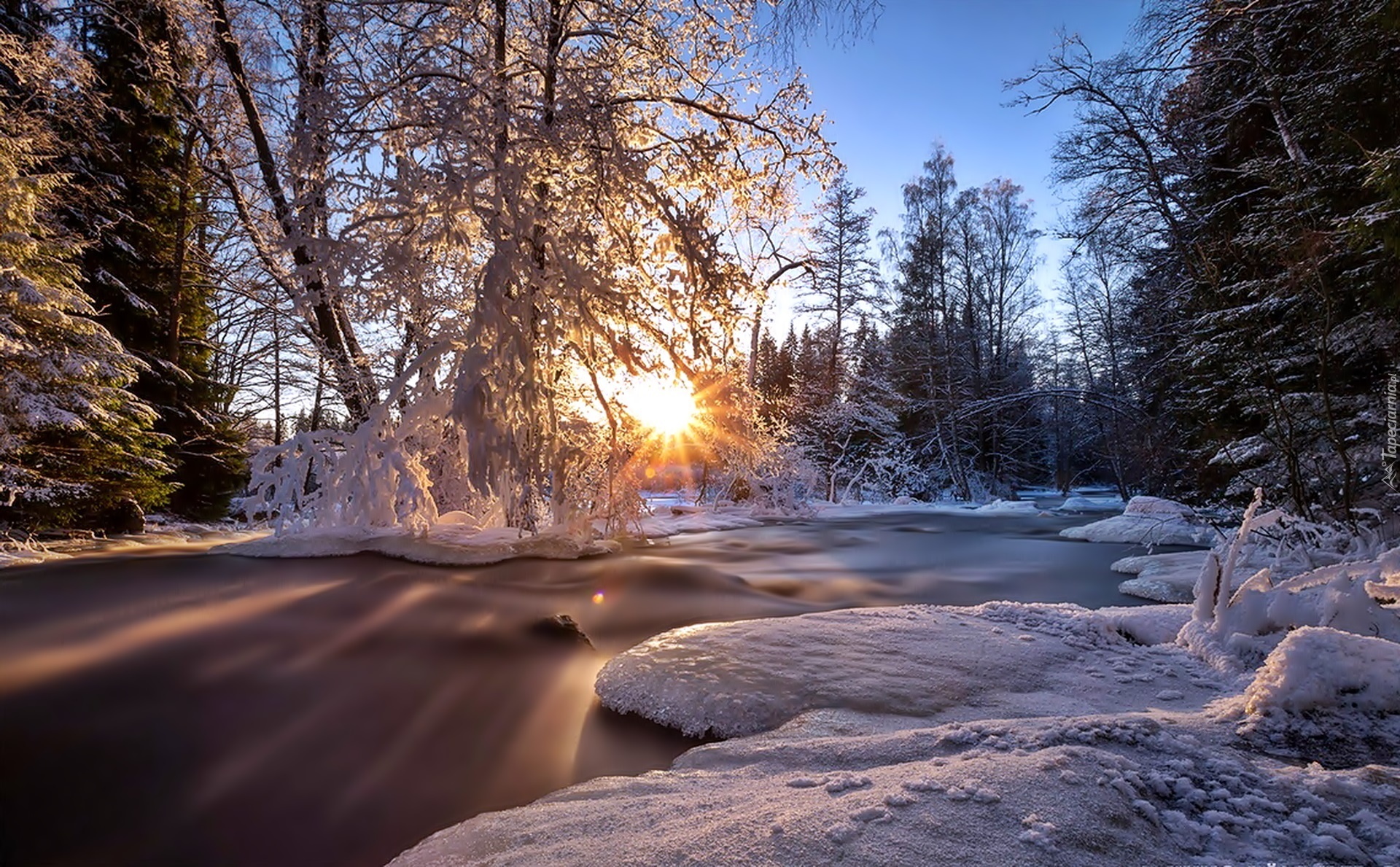 Edytor tapety: Zima, Las, Promienie Słońca, Zamarznięta, Rzeka