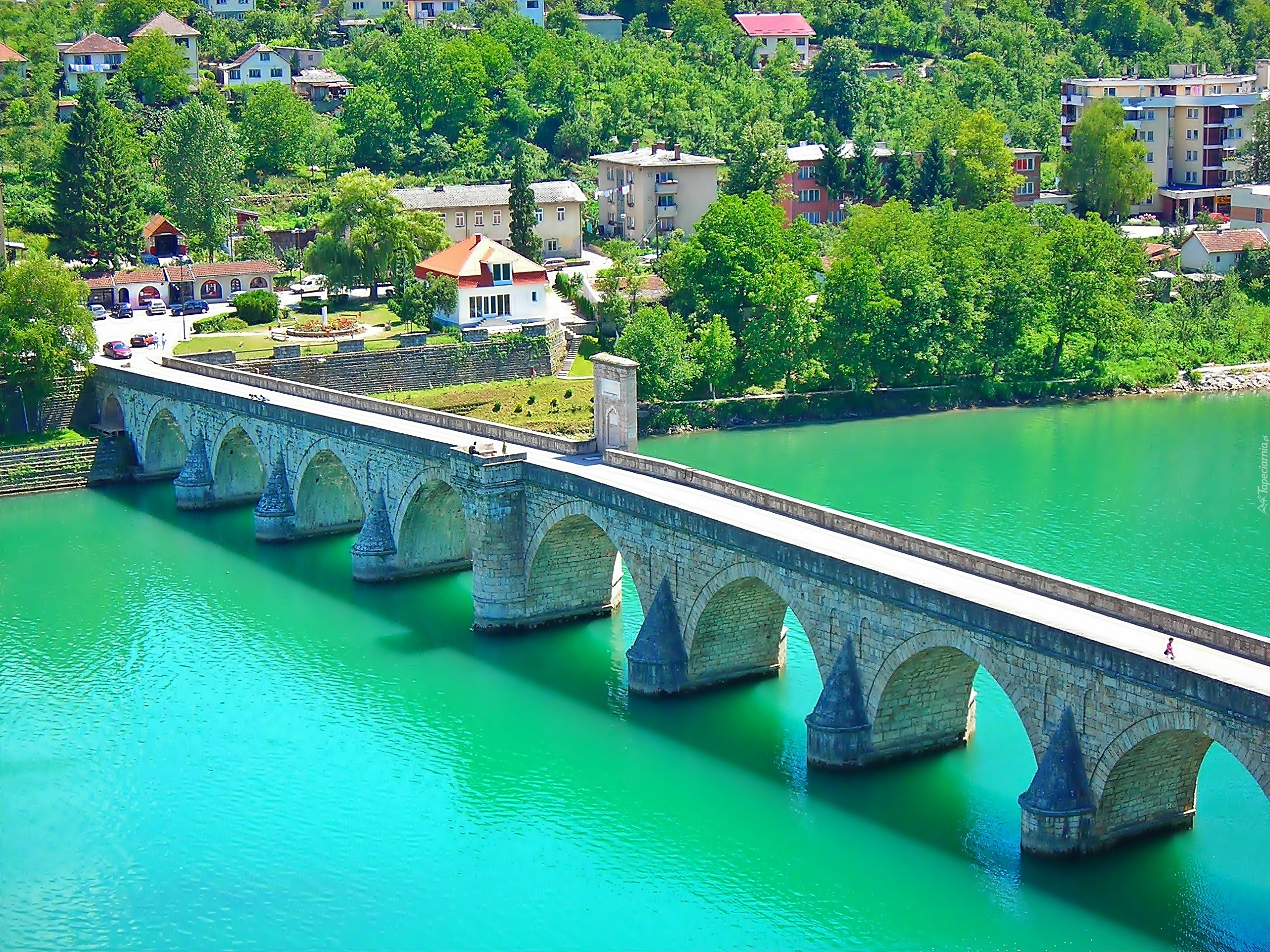Edytor tapety: Most, Rzeka, Drzewa, Budynki, Domy