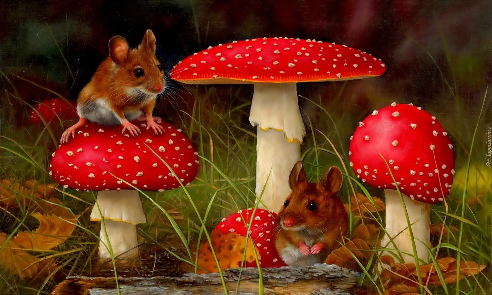 Edytor tapety: Dwie, Myszki, Muchomory, Liście, Trawa