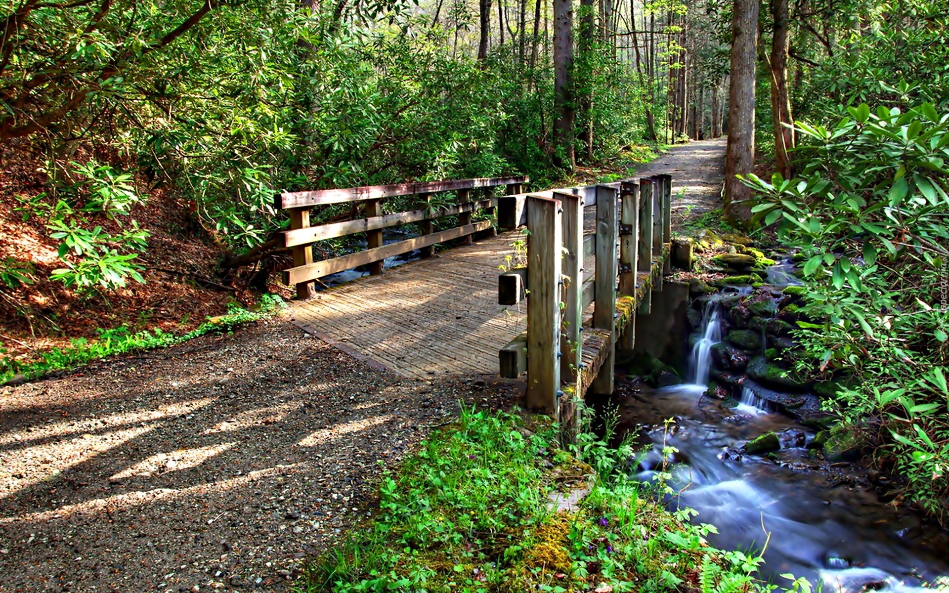 Edytor tapety: Las, Drzewa, Droga, Most, Rzeka