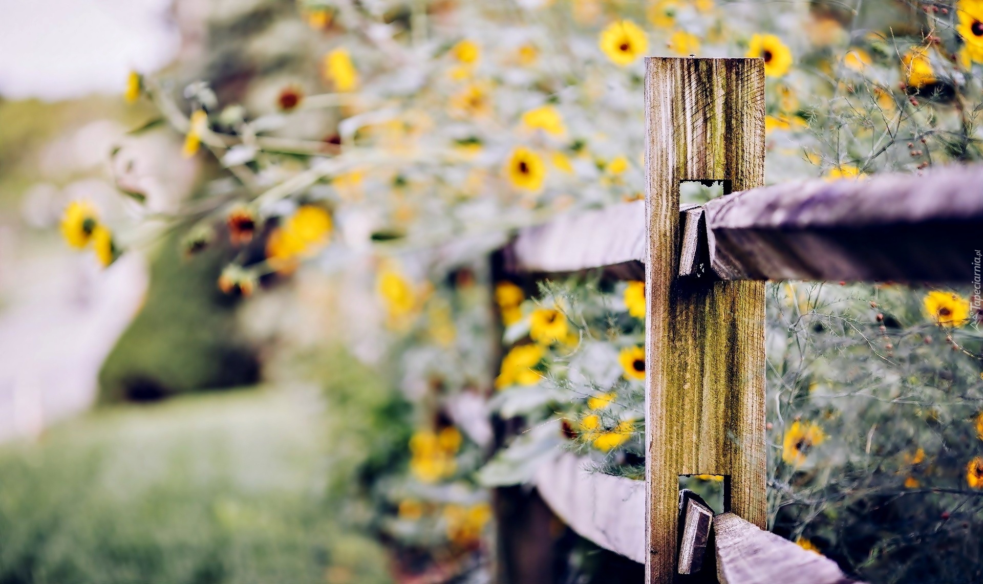Edytor tapety: Żółte, Kwiaty, Drewniany, Płot, Ogród
