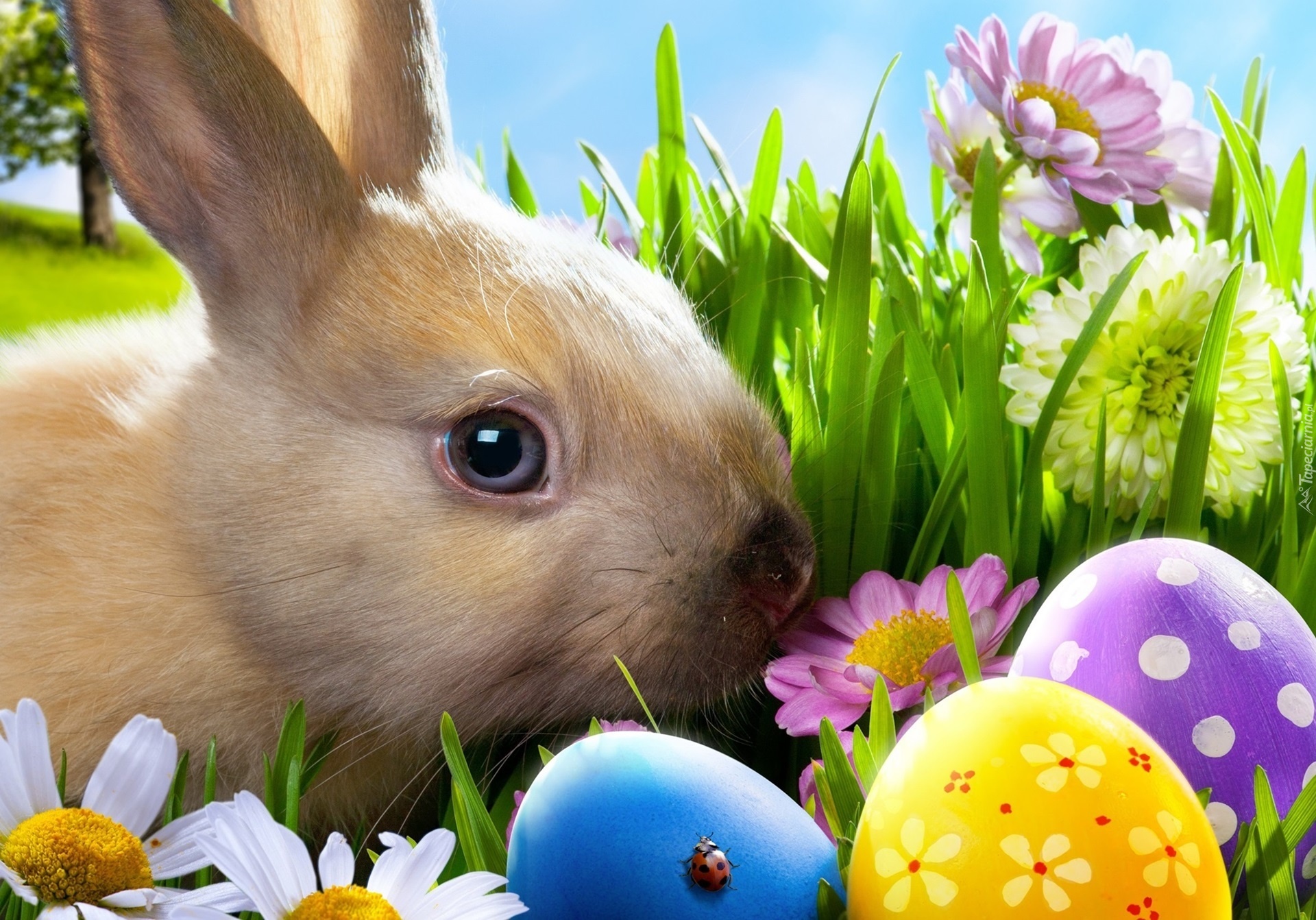 Edytor tapety: Wielkanoc, Króliczek, Kolorowe, Pisanki, Kwiaty