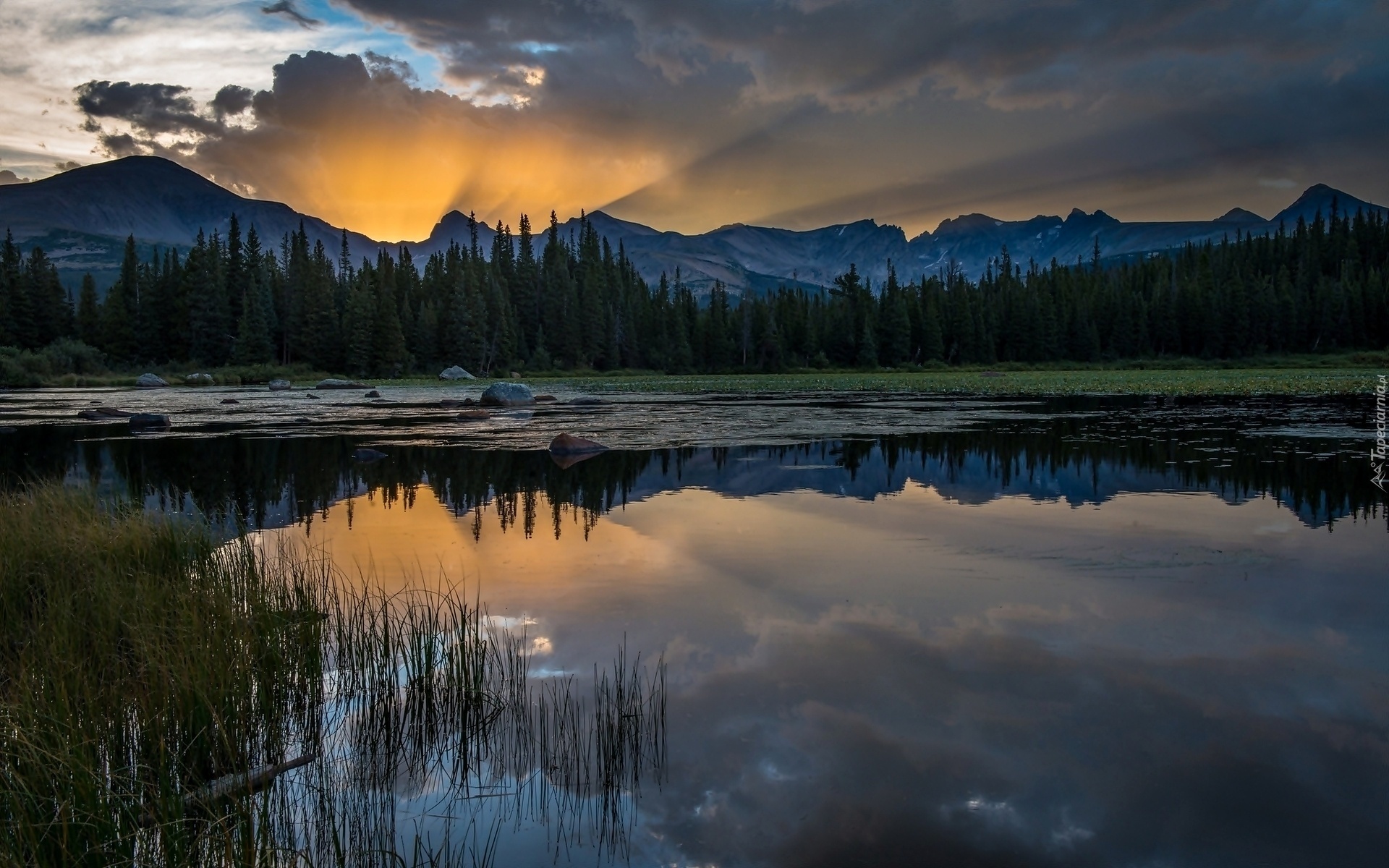 Edytor tapety: Góry, Jezioro, Promienie Słońca, Przebijające, Światło