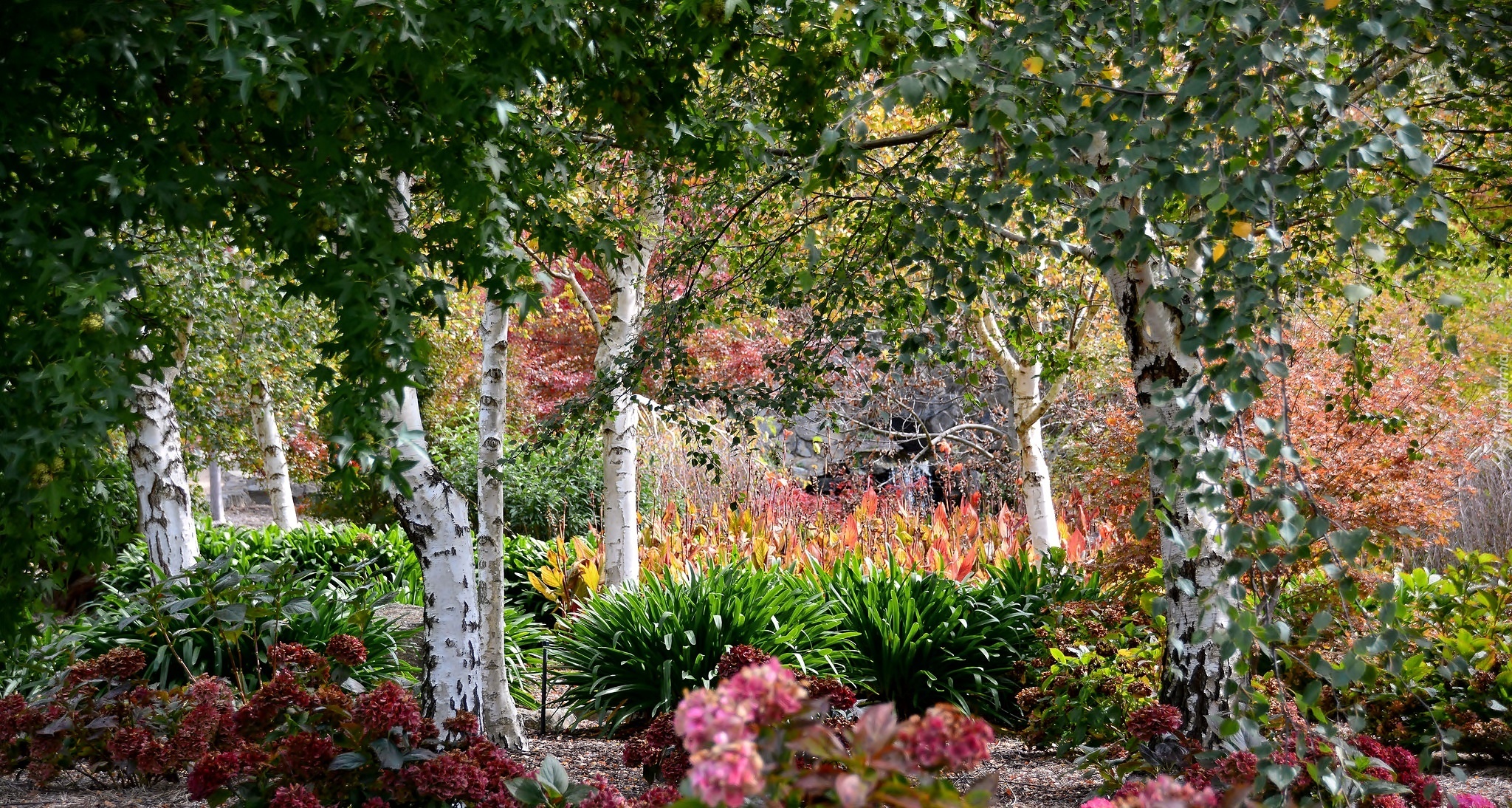 Edytor tapety: Ogród, Kwiaty, Zieleń, Drzewa, Brzozy