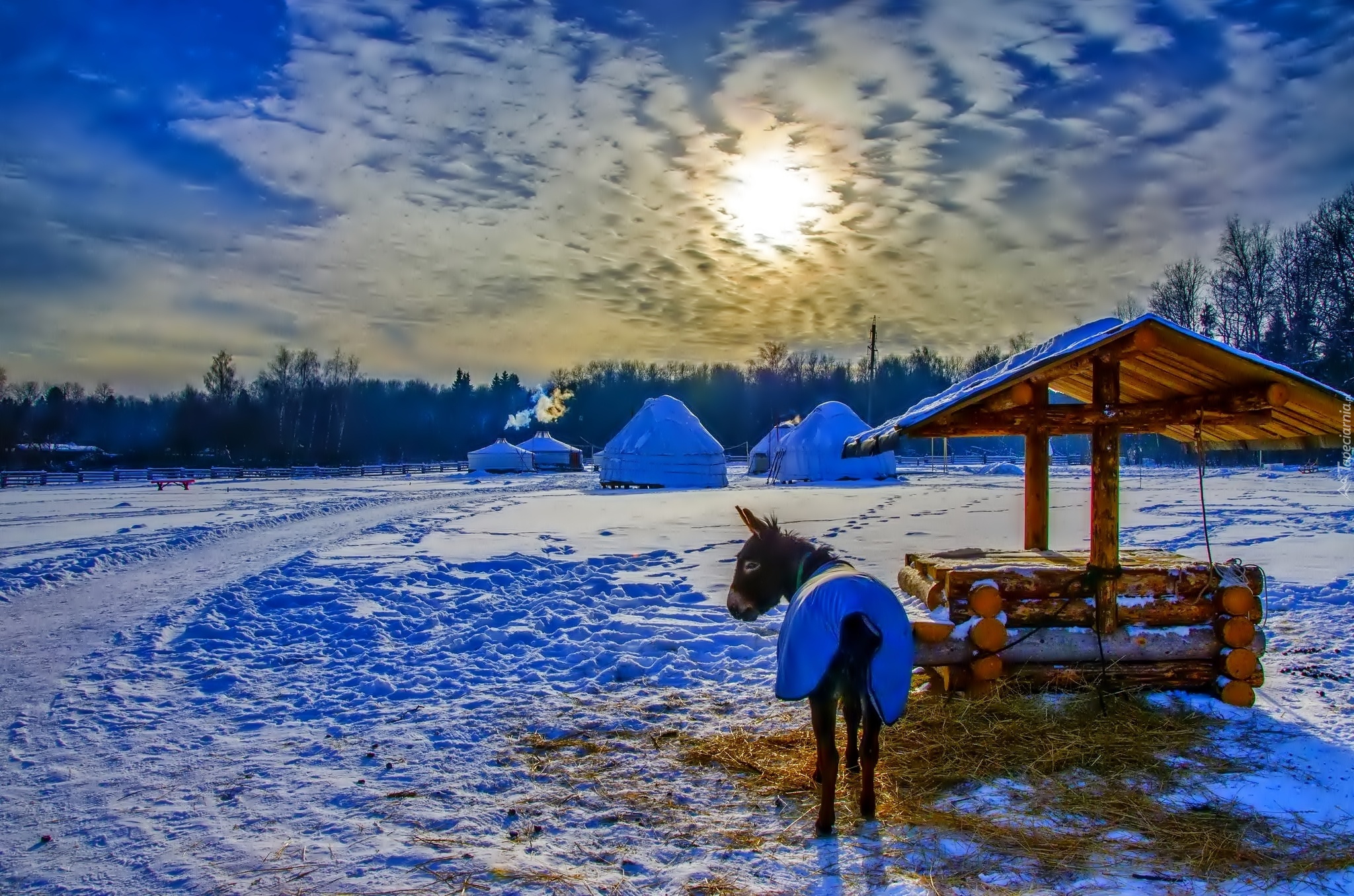 Edytor tapety: Osioł, Namioty, Zima