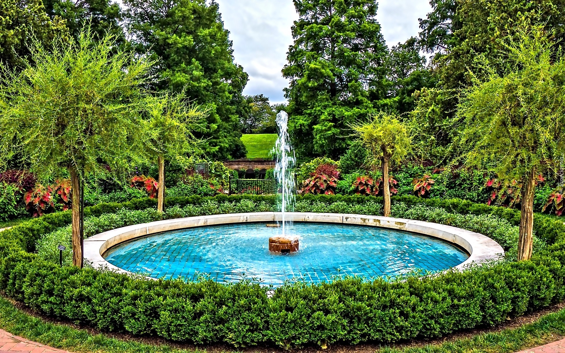 Edytor tapety: Ogród, Fontanna, Drzewa, Krzewy, Kwiaty