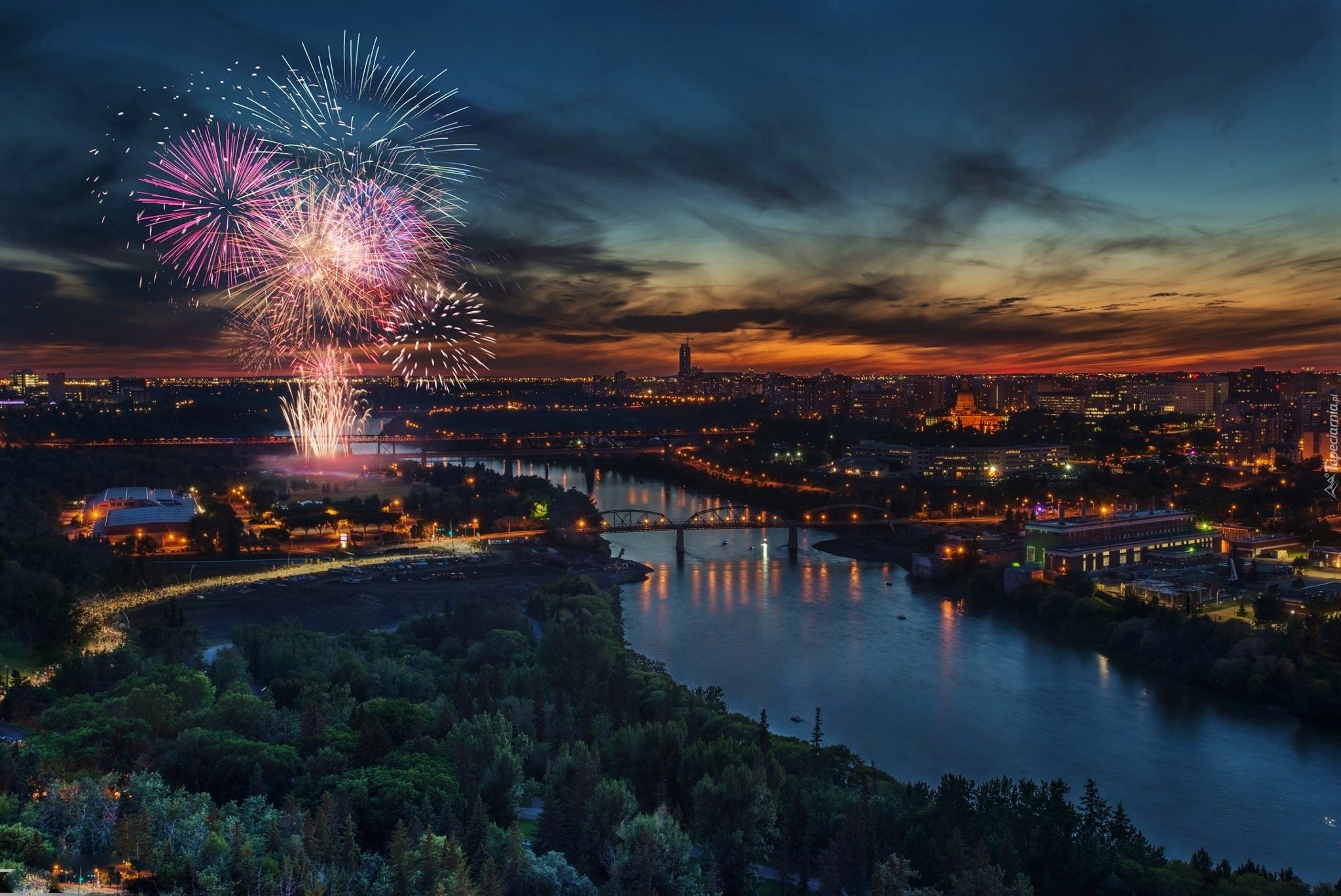 Edytor tapety: Rzeka, Miasto, Noc, Fajerwerki