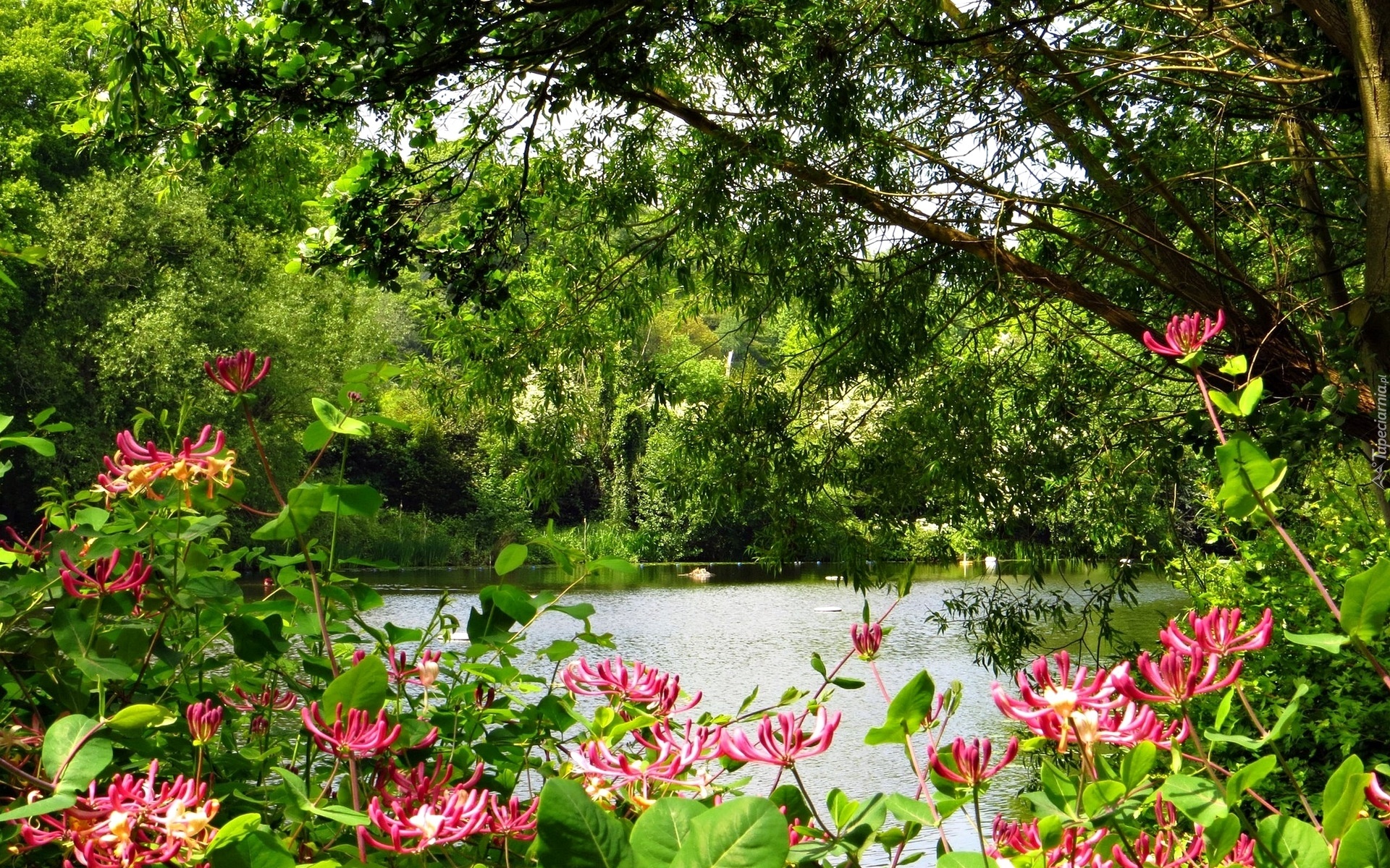 Edytor tapety: Ogród, Park, Staw, Drzewa, Kwiaty