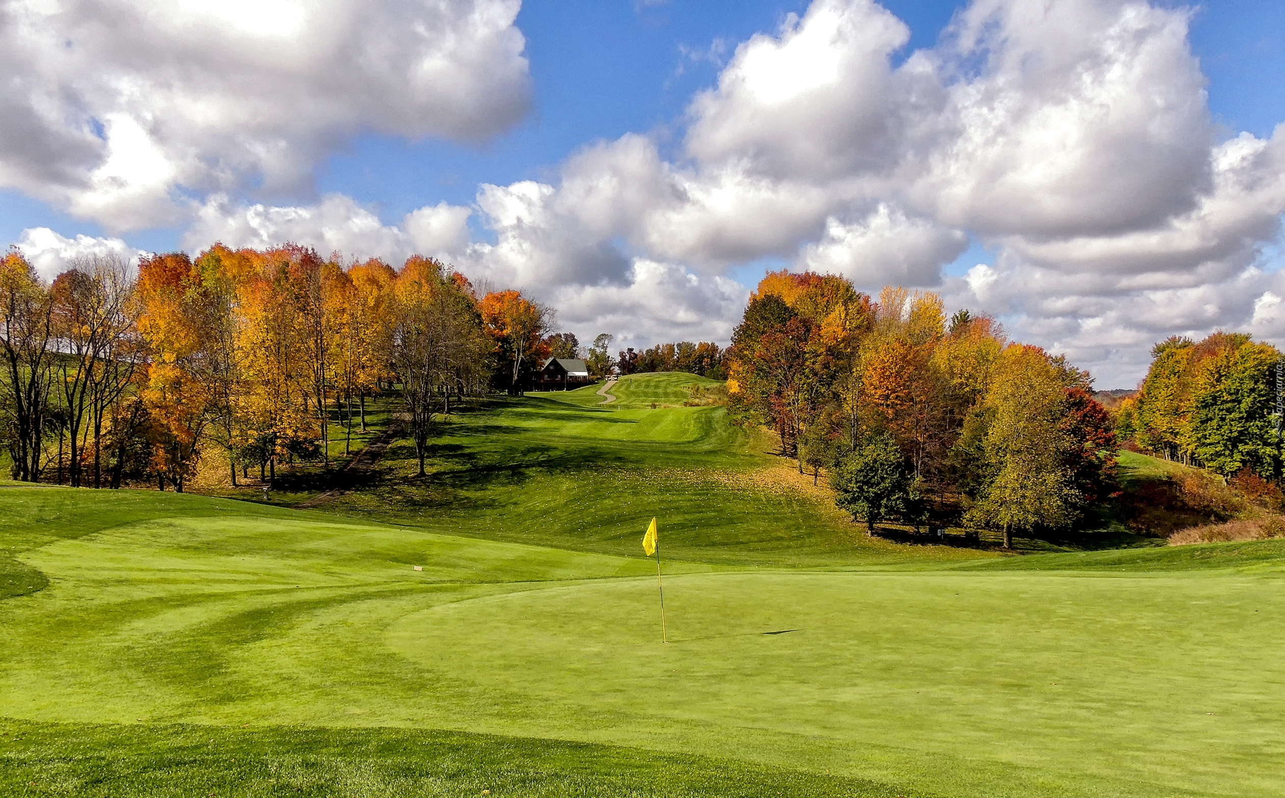 Edytor tapety: Jesień, Pole, Golfowe, Drzewa, Domek